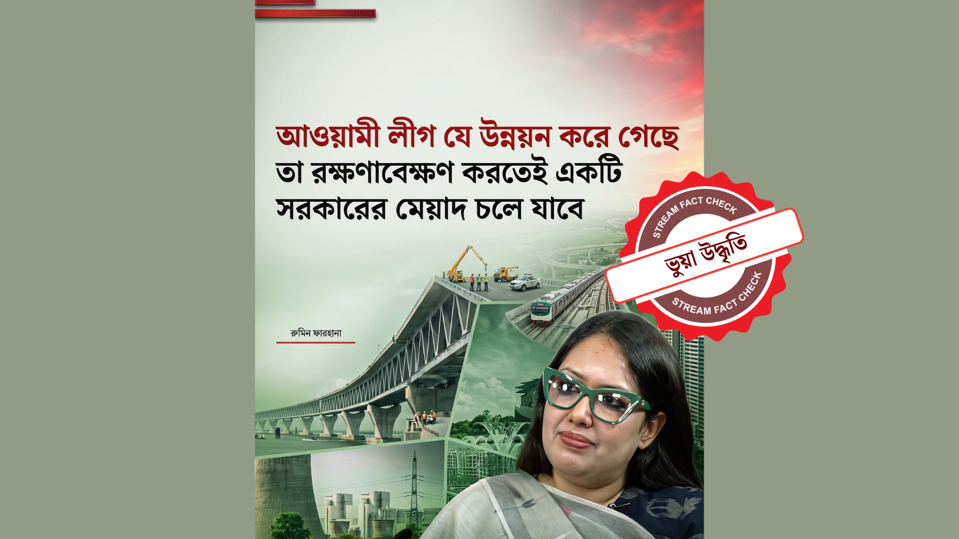 সম্প্রতি ফেসবুকে ব্রাহ্মণবাড়িয়া-২ (সরাইল-আশুগঞ্জ) আসনের সংসদ সদস্য রুমিন ফারহানাকে উদ্ধৃত করে একটি ফটোকার্ড ছড়িয়ে পড়েছে। এতে দাবি করা হচ্ছে, তিনি বলেছেন— আওয়ামী লীগ যে উন্নয়ন করে গেছে, তা রক্ষণাবেক্ষণ করতেই একটি সরকারের মেয়াদ চলে যাবে। তবে যাচাইয়ে রুমিন ফারহানার নামে প্রচারিত এই বক্তব্যের পক্ষে কোনো নির্ভরযোগ্য প্রমাণ পাওয়া যায়নি। প্রকৃতপক্ষে, নির্ভরযোগ্য তথ্যসূত্র ছাড়াই তাঁর নামে বানোয়াট একটি মন্তব্য প্রচার করা হয়েছে।