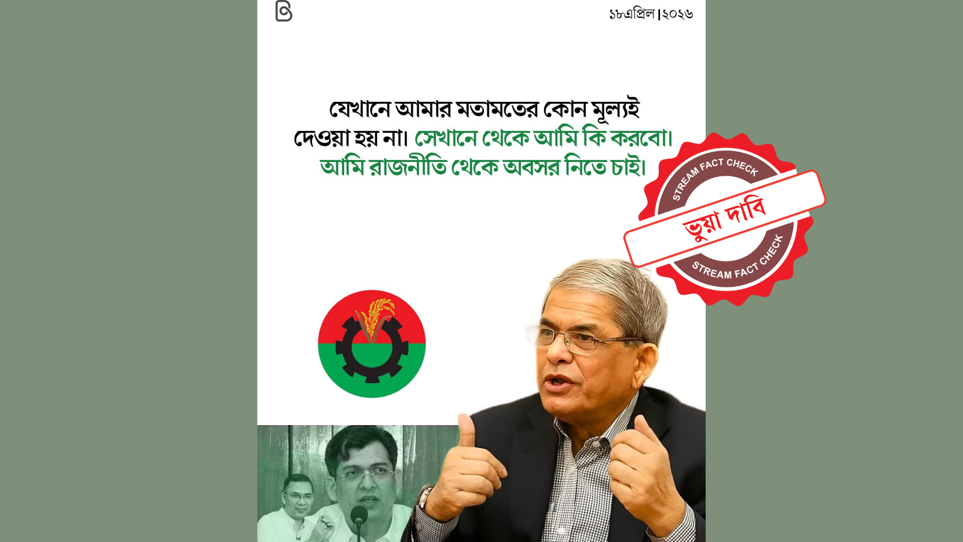 সম্প্রতি ফেসবুকে স্থানীয় সরকার, পল্লী উন্নয়ন ও সমবায়মন্ত্রী মির্জা ফখরুল ইসলাম আলমগীরকে নিয়ে একটি ফটোকার্ড ছড়িয়ে পড়েছে। ফটোকার্ডটিতে দাবি করা হচ্ছে, তিনি বলেছেন, ‘যেখানে আমার মতামতের কোনো মূল্যই দেওয়া হয় না। সেখানে থেকে আমি কি করবো। আমি রাজনীতি থেকে অবসর নিতে চাই।’