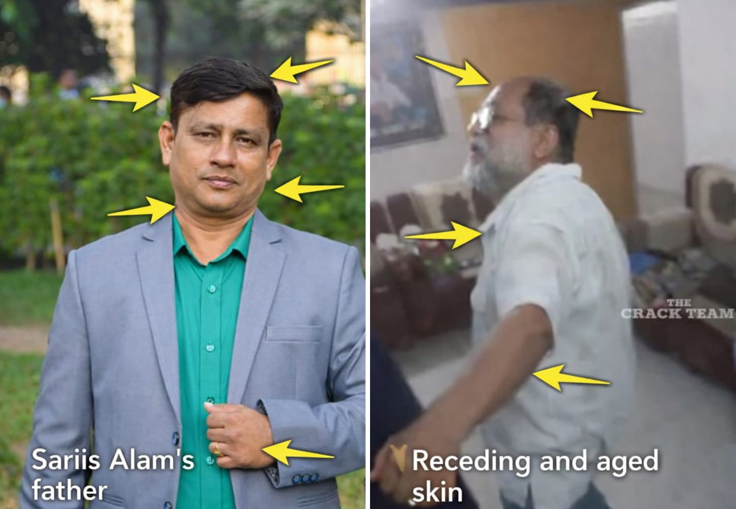 অন্যদিকে, সারজিস আলমের বাবার ছবির ব্যক্তি কম বয়সী এবং মুখাবয়ব আলাদা। যদিও ভিডিওটি লো-রেজ্যুলিউশন, আলো কম এবং ক্যামেরা নড়াচড়া বেশি হওয়ায় মুখ স্পষ্ট নয়। তবু দৃশ্যমান অংশগুলো যেমন মুখের গঠন, চুলের ধরন (হেয়ারলাইন) এবং দেহভঙ্গি সারজিস আলমের বাবার ছবির সঙ্গে সামঞ্জস্যপূর্ণ নয়।