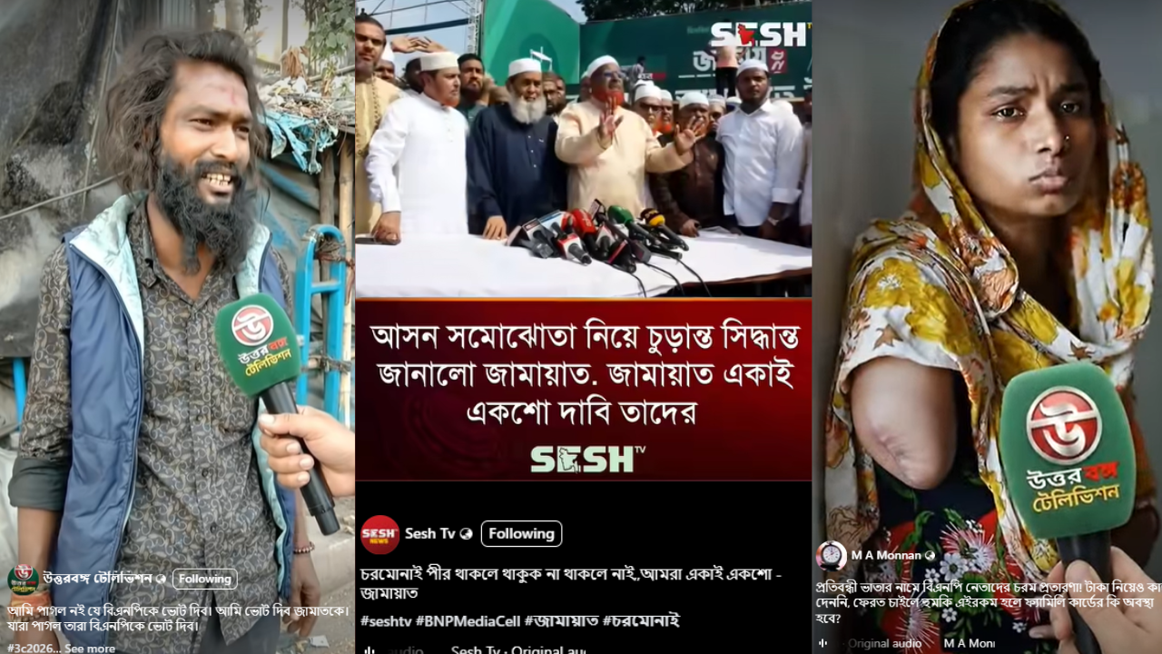 ভোটারের সহানুভূতি আদায়ে এআই নির্মিত ভিডিও ব্যবহার করা হচ্ছে। ফেসবুকের একটি ভিডিওতে এক নারী বলছেন– প্রতিবন্ধী কার্ডের কথা বলে এক বিএনপি নেতা টাকা নিয়েও কার্ড দেননি। তাই তিনি বিএনপিকে ভোট দেবেন না; দাঁড়িপাল্লায় ভোট দেবেন। মূলত উত্তরবঙ্গ টেলিভিশন নামের ফেসবুক অ্যাকাউন্ট থেকে গত ১০ জানুয়ারি ভিডিওটি প্রথম পোস্ট করা হয়।
