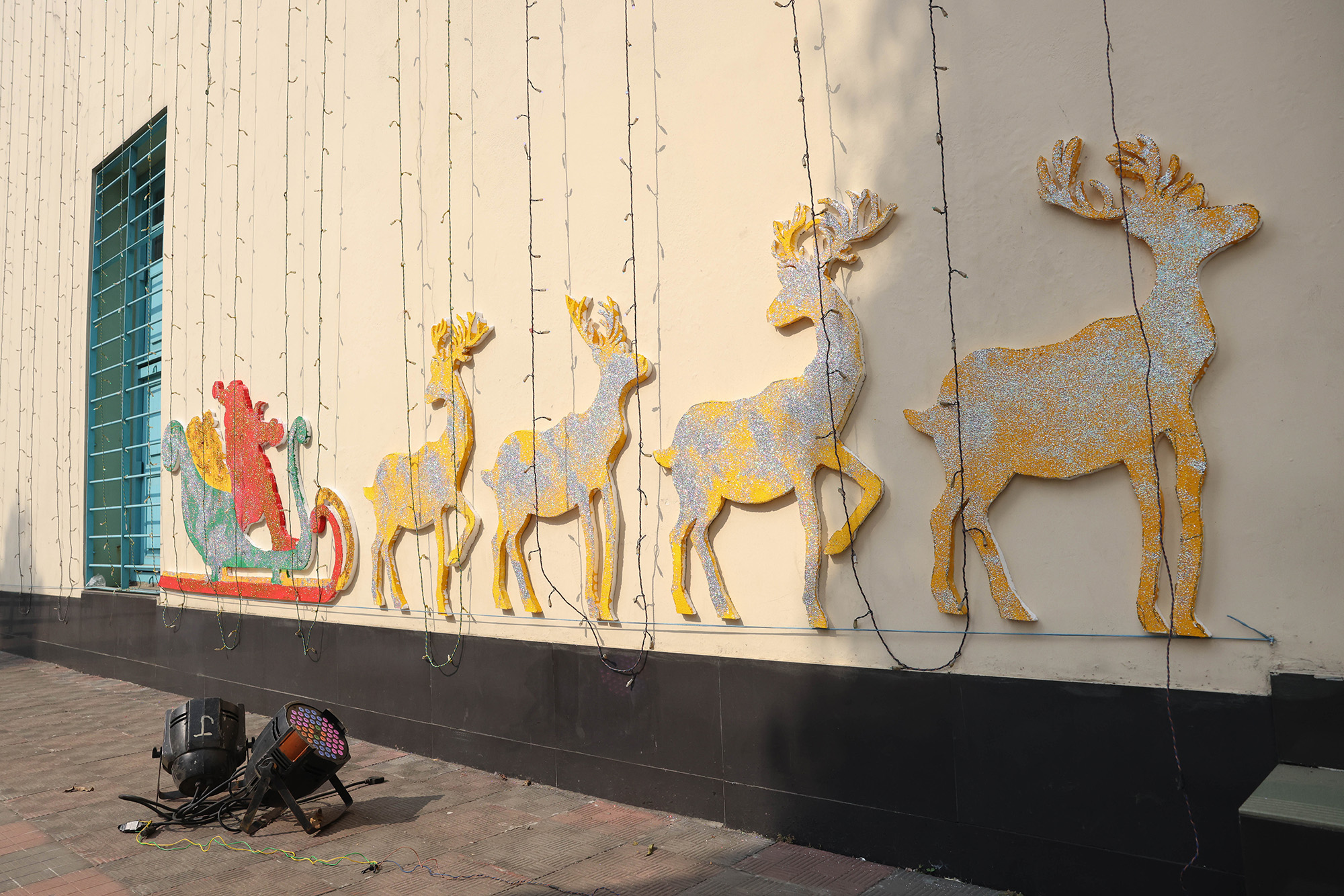 দেয়ালে সাজানো সান্তা ক্লজের বাহন হরিণ টানা স্লেজ গাড়ি