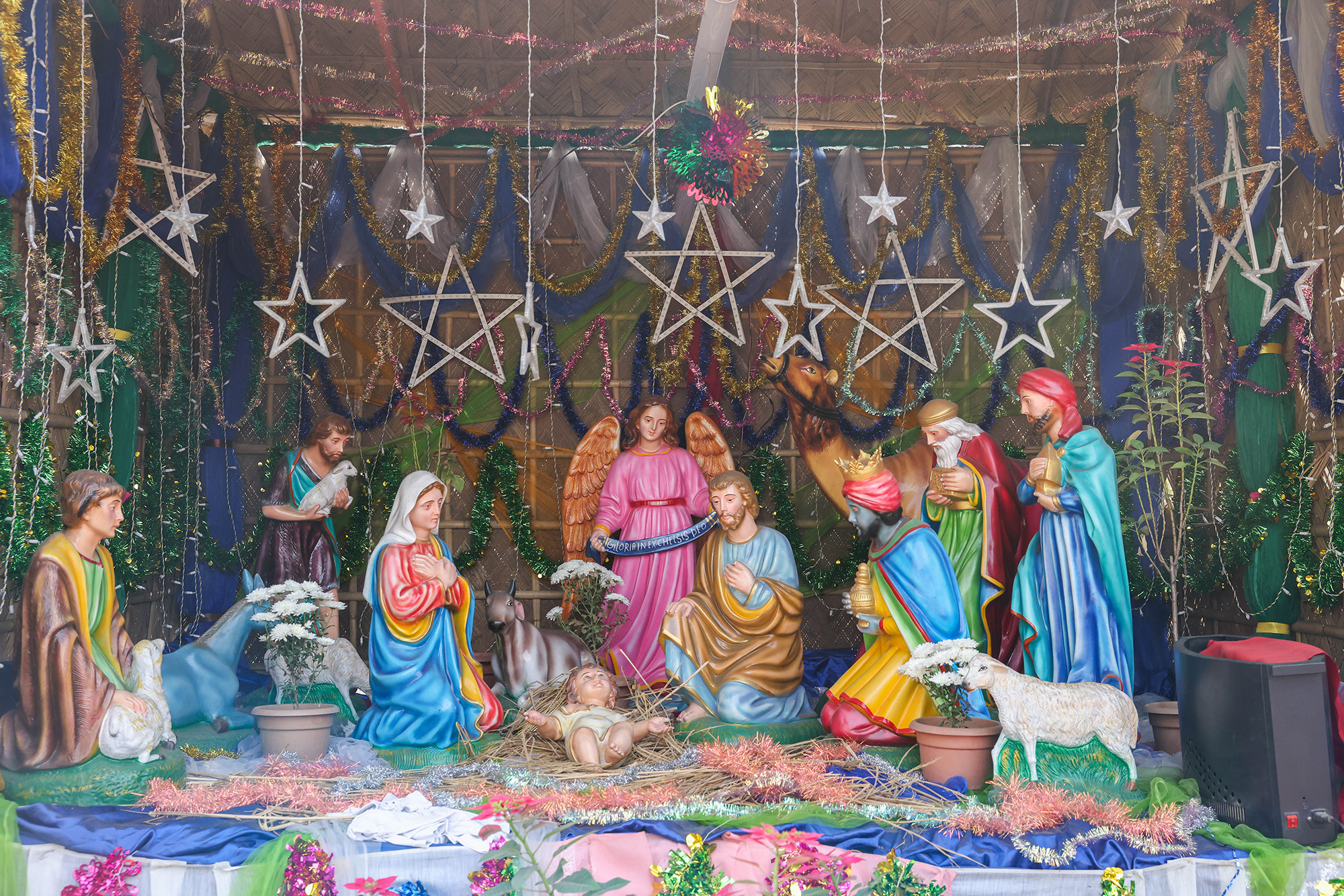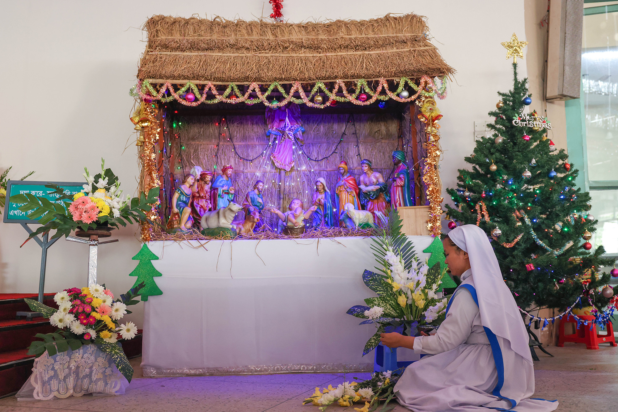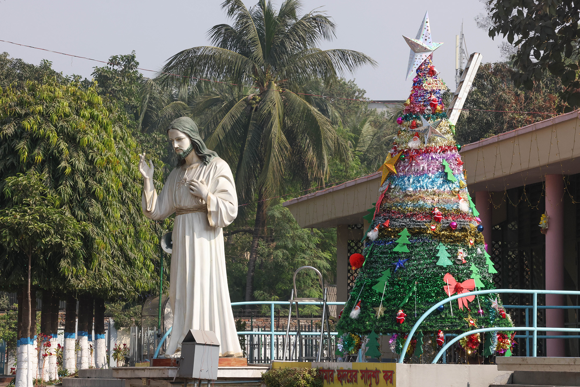 যিশু খ্রিষ্টের প্রতিকৃতির পাশে তৈরি করা হয়েছে বড় আকারের ক্রিসমাস ট্রি