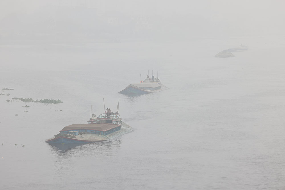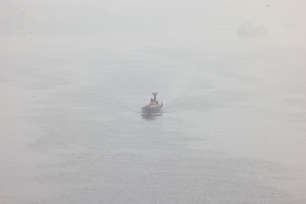 ঘন কুয়াশার মধ্য দিয়ে বুড়িগঙ্গা নদীতে ছুটে চলছে ছোট্ট নৌকাটি