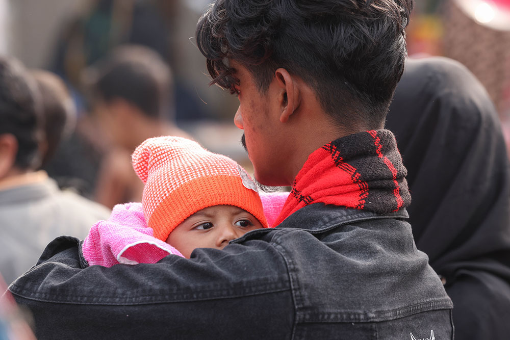 ঠান্ডা থেকে রক্ষা পেতে কোলের সন্তানকে গরম কাপড়ে মুড়িয়ে যাচ্ছেন এক বাবা