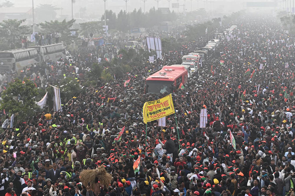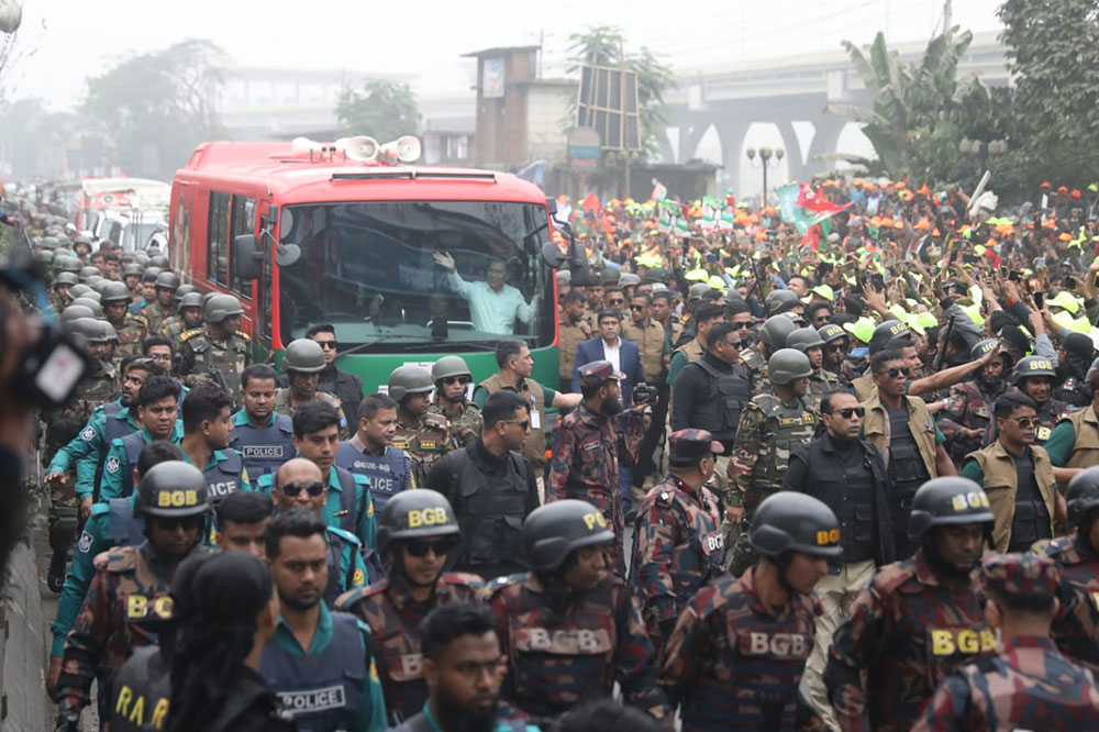 বিমানবন্দর থেকে বাসে করে পূর্বাচলে নির্মিত গণসংবর্ধনা মঞ্চের উদ্দেশে যাত্রা করেন তারেক রহমান। তাঁকে স্বাগত জানাতে বিমানবন্দরের আশপাশের সড়ক ও পূর্বাচলে লাখ লাখ নেতা-কর্মী ভিড় করেন। তিনি হাত নেড়ে উচ্ছ্বসিত নেতা-কর্মীদের শুভেচ্ছার জবাব দেন।