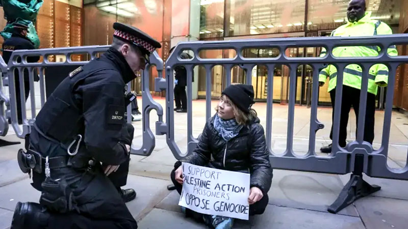 যুক্তরাজ্যভিত্তিক প্রচারসংস্থা প্রিজনার্স ফর প্যালেস্টাইন জানিয়েছে, গ্রেটা থুনবার্গ ‘আমি প্যালেস্টাইন অ্যাকশন বন্দীদের সমর্থন করি। আমি গণহত্যার বিরোধিতা করি’—এমন লেখা সংবলিত একটি প্ল্যাকার্ড হাতে নিয়ে বিক্ষোভে অংশ নেওয়ায় তাঁকে সন্ত্রাসবাদ আইনে গ্রেপ্তার করা হয়।