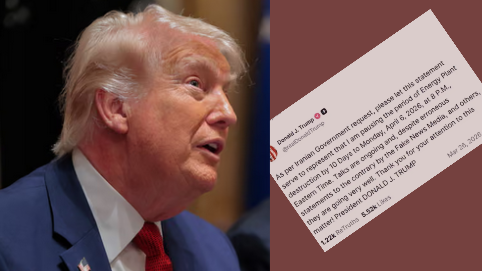 ট্রাম্প তাঁর পোস্টে উল্লেখ করেন, ইরান সরকারের অনুরোধের পরিপ্রেক্ষিতে দেশটির জ্বালানি স্থাপনায় কোনো ধরনের ধ্বংসযজ্ঞ না চালানোর এই সিদ্ধান্ত নেওয়া হয়েছে। যুক্তরাষ্ট্রের স্থানীয় সময় অনুযায়ী, আগামী ৬ এপ্রিল রাত ৮টা পর্যন্ত এই স্থগিতাদেশ কার্যকর থাকবে। তিনি আরও দাবি করেন, ইরানের সঙ্গে বর্তমানে আলোচনা চলছে এবং বিভিন্ন ‘ভুয়া সংবাদমাধ্যম’ ভুল খবর প্রচার করলেও এই আলোচনা বেশ ইতিবাচকভাবে এগিয়ে যাচ্ছে। এর আগে গত ২৩ মার্চ ট্রাম্প ঘোষণা দিয়েছিলেন যে ২৭ মার্চ পর্যন্ত ইরানের জ্বালানি স্থাপনায় হামলা বন্ধ রাখবে মার্কিন বাহিনী।