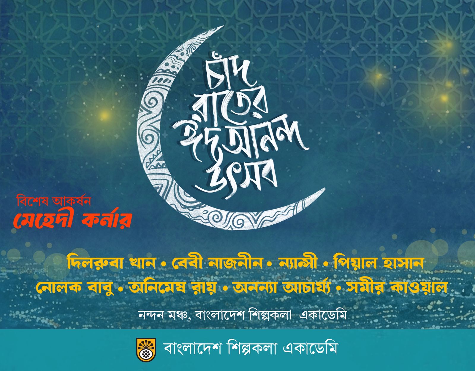 পবিত্র ঈদুল ফিতরের আনন্দ সাধারণ মানুষের মধ্যে ছড়িয়ে দিতে বিশেষ অনুষ্ঠান ‘চাঁদ রাতের ঈদ আনন্দ উৎসব-২০২৬’ আয়োজন করেছে বাংলাদেশ শিল্পকলা একাডেমি।
