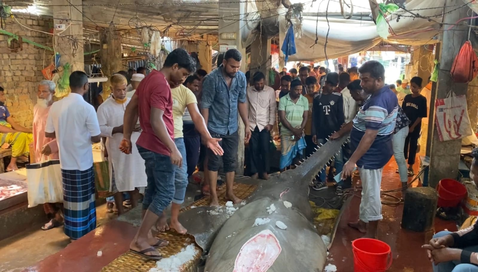 বঙ্গোপসাগরে জেলেদের জালে প্রায় ২৫ মণ ওজনের একটি করাত হাঙ্গর (স’ফিস) ধরা পড়েছে। বুধবার (১ এপ্রিল) সকাল ১০টার দিকে পিরোজপুরের মঠবাড়িয়া বাজারে তোলা হলো মাছটি দেখতে ভিড় করেন ক্রেতারা। পরে মাছটি কেটে ভাগ হিসেবে প্রায় ৮ লাখ টাকা বিক্রি করেছেন দুজন ব্যবসায়ী।