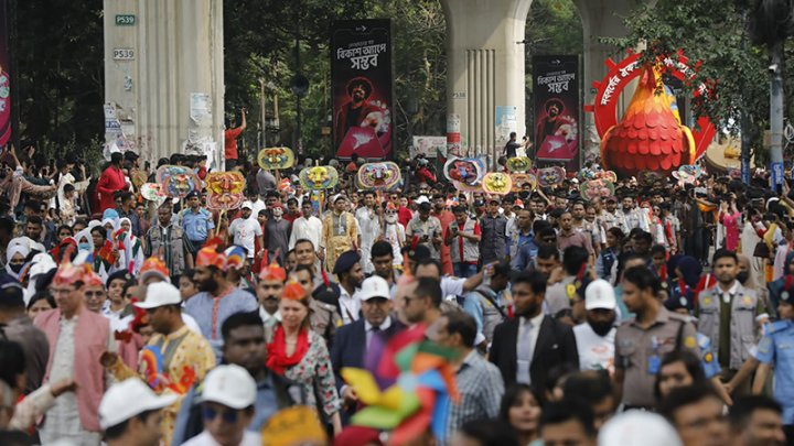 বাংলা নববর্ষ ১৪৩৩ উপলক্ষে ঢাকা বিশ্ববিদ্যালয়ের চারুকলা অনুষদ আয়োজিত বৈশাখী শোভাযাত্রায় মঙ্গলবার (১৪ এপ্রিল) সকালে নানা শ্রেণি-পেশার মানুষের ঢল নেমেছে। নতুন বছরকে বরণের উৎসবে মেতেছে সবাই।