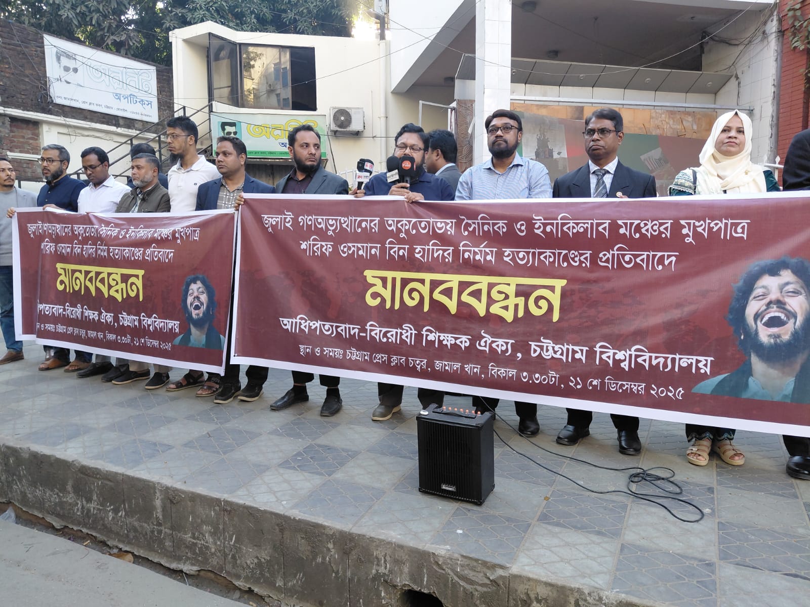 শহিদ শরিফ ওসমান বিন হাদির হত্যার দ্রুত বিচার দাবি করে চট্টগ্রাম বিশ্ববিদ্যালয়ের (চবি) শিক্ষক ড. জামাল উদ্দিন বলেছেন, ‘আমরা যদি আধিপত্যবাদ-বিরোধী শক্তির ঐক্যের প্রতীক শরিফ ওসমান হাদির হত্যার বিচার না পাই, তাহলে লাখ লাখ মানুষ জানাজায় গিয়ে কোনো লাভ নেই।’