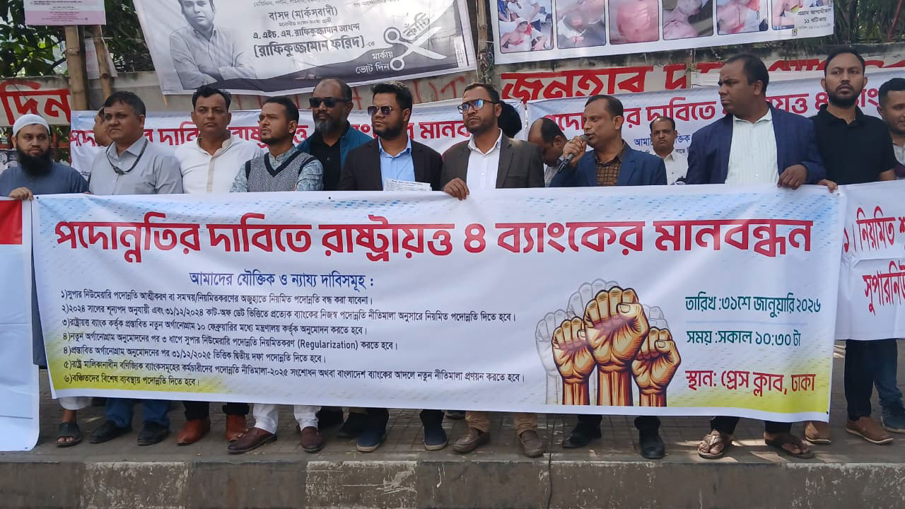 মানববন্ধনে রাষ্ট্রায়ত্ত ব্যাংক কর্মকর্তা ঐক্য পরিষদের আহ্বায়ক মোতাহার হোসেন বলেন, ‘আমাদের প্রথম দাবি হলো, ২০২৪ ভিত্তিক পদোন্নতি ১ জানুয়ারি ২০২৫ থেকে কার্যকর করতে হবে। আর্থিক প্রতিষ্ঠান বিভাগের ১৪ অক্টোবরের স্মারকের কারণে নিয়মিত পদোন্নতি বন্ধ রয়েছে। আমরা চাই, সুপারনিউমারারি পদ একদফায় সমন্বয় না করে অরগানোগ্রাম পাসের পর তিন ধাপে সমন্বয় করা হোক।’