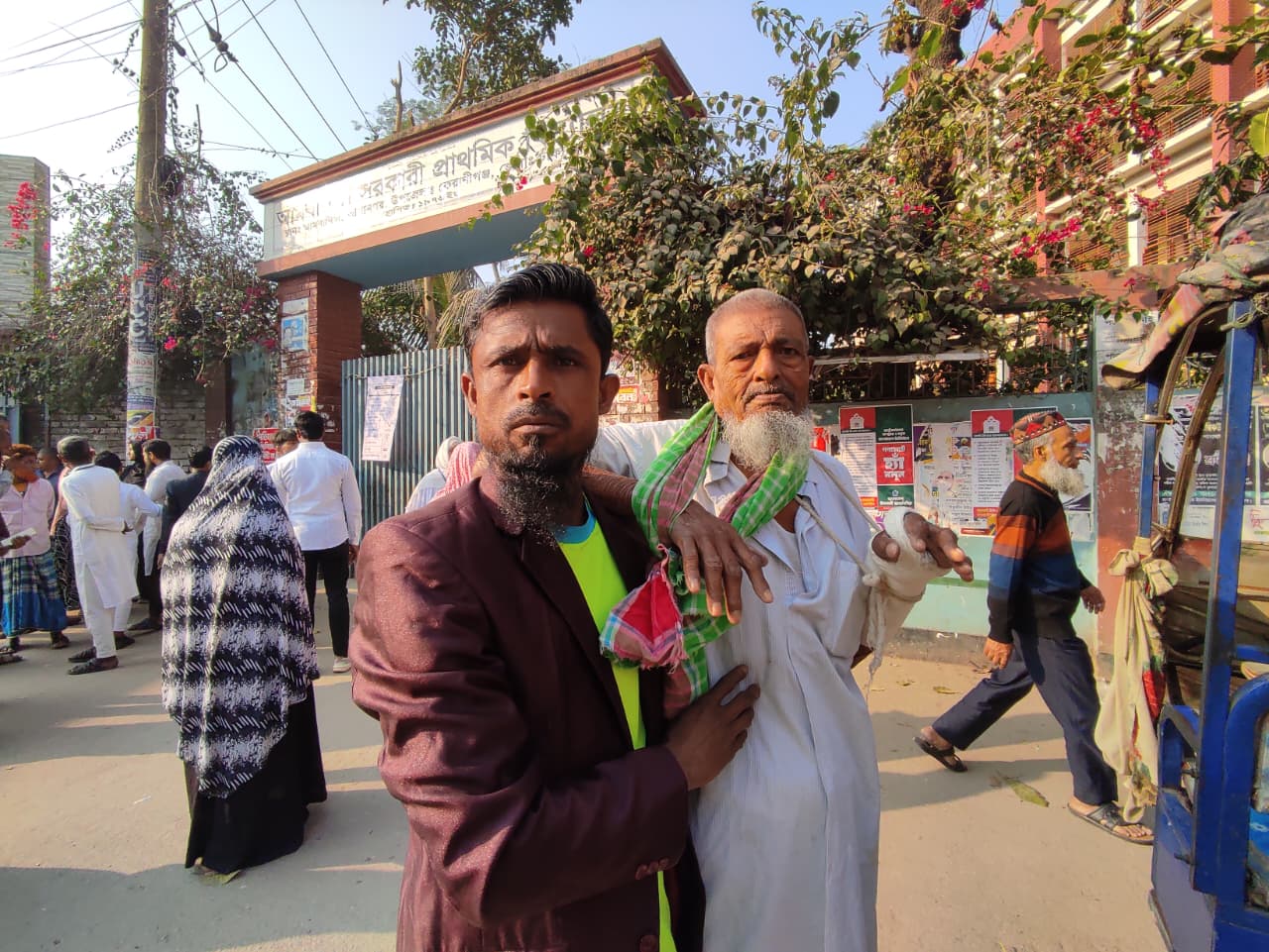 আগানগর ইউনিয়নের বাসিন্দা আবদুল হাকিমের এক হাত ভাঙা৷ কিছুদিন আগে দুর্ঘটনার শিকার হয়ে হাতপাতালে ভর্তি হয়েছেন৷ কিছুটা সুস্থ হওয়ায় বাবা আবদুল হাকিমকে নিয়ে ভোটকেন্দ্রে এসেছেন তাঁর ছেলে মোহাম্মদ লিটন৷ একই কেন্দ্রে শাশুড়িকে নিয়ে এসেছেন এক পুত্রবধূ।