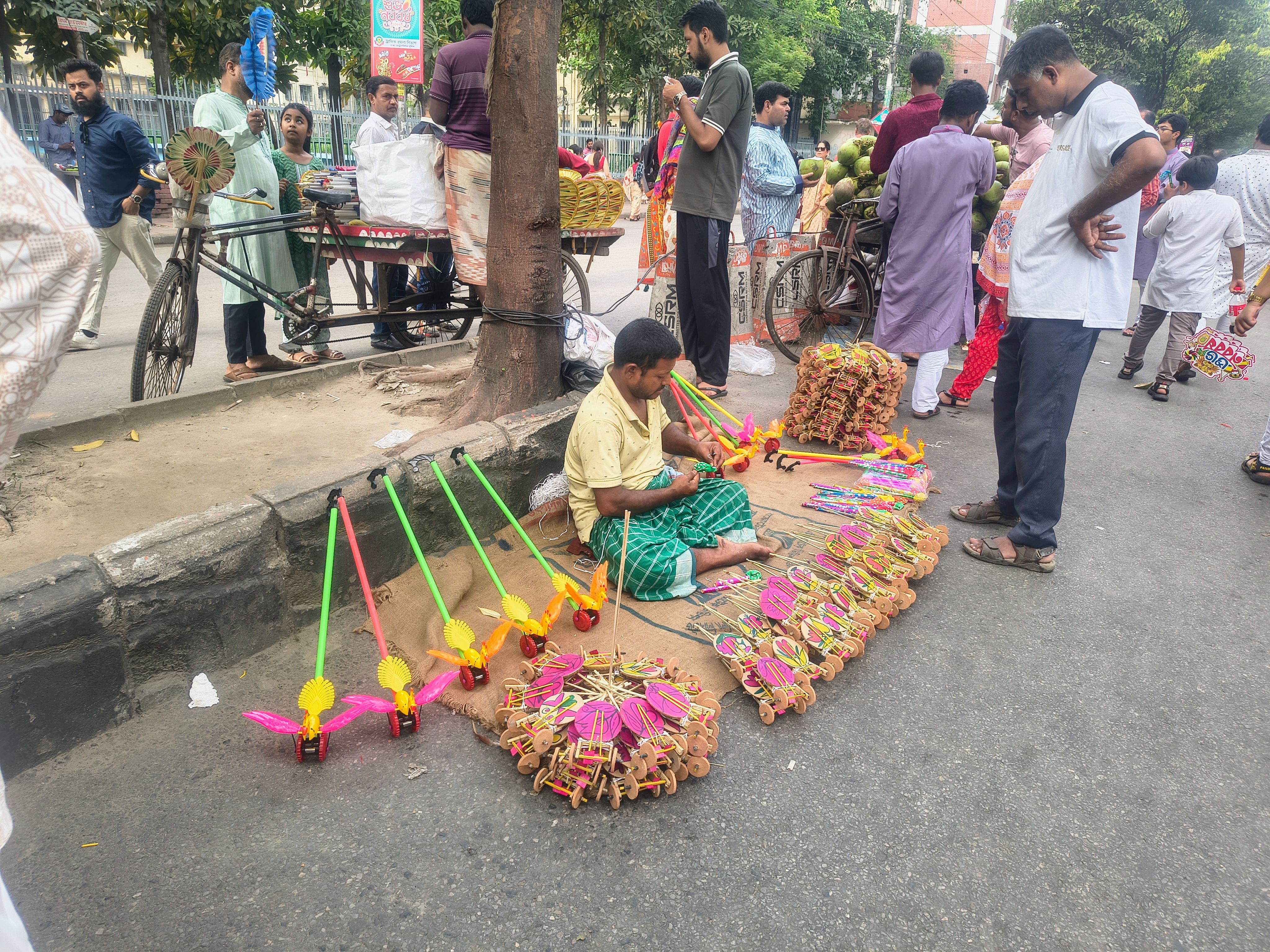 সড়ক বন্ধ, তাতে কী! বন্ধ সড়কের দুই ধারে নানা পণ্যের পসরা সাজানো। আগ্রহ নিয়ে সেসব পণ্য নেড়েচেড়ে দেখছেন পথচারীরা। কেউ কেউ কিনছেন দু-একটি পণ্য। চরকি, খেলনা টমটম, ময়ূর, একতারা, ডুগডুগি আর তালপাতার হাতপাখাসহ নানা পণ্যে শিশুদের পাশাপাশি বড়দেরও আগ্রহ দেখা গেল।