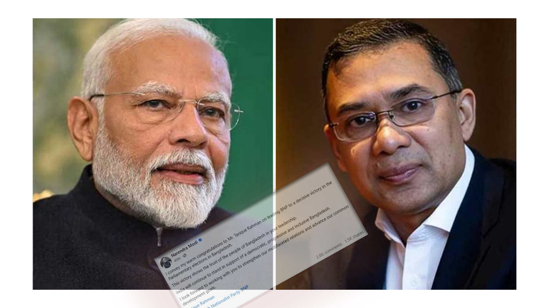 ত্রয়োদশ জাতীয় সংসদ নির্বাচনে ঐতিহাসিক বিজয়ের জন্য বাংলাদেশ জাতীয়তাবাদী দলের (বিএনপি) চেয়ারম্যান তারেক রহমানকে অভিনন্দন জানিয়েছেন ভারতের প্রধানমন্ত্রী নরেন্দ্র মোদি।