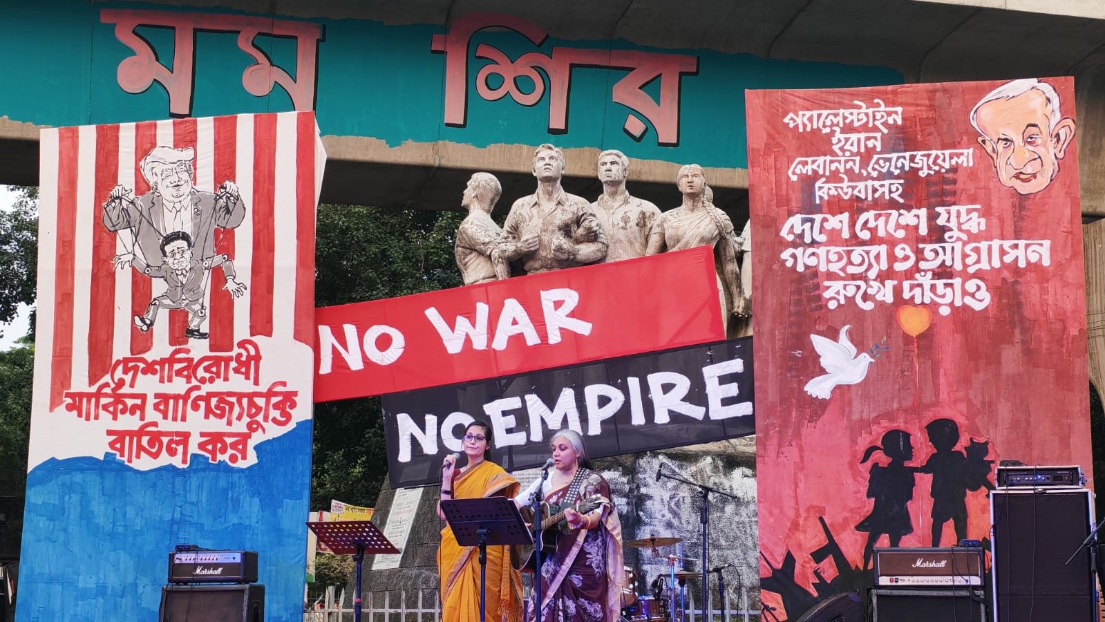 বিশ্বজুড়ে চলমান সাম্রাজ্যবাদী আগ্রাসন বন্ধ এবং বাংলাদেশের স্বার্থবিরোধী মার্কিন বাণিজ্য চুক্তি বাতিলের দাবিতে টিএসসিতে কনসার্ট অনুষ্ঠিত হয়েছে। শুক্রবার (২৪ এপ্রিল) বিকেলে ঢাকা বিশ্ববিদ্যালয়ের ‘নো ওয়ার, নো এম্পায়ার’ শীর্ষক কনসার্টে শিক্ষার্থী, রাজনৈতিক ও সাংস্কৃতিক কর্মীরা অংশ নেন।