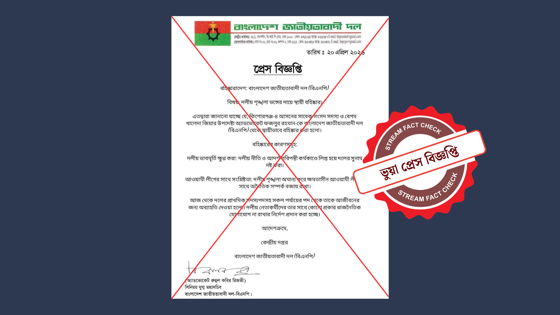 সম্প্রতি ফেসবুকে বিএনপির প্যাডে প্রকাশিত একটি প্রেস বিজ্ঞপ্তি ছড়িয়ে দাবি করা হচ্ছে, এতে কিশোরগঞ্জ-৪ আসনের সংসদ সদস্য ও বিএনপি চেয়ারম্যানের উপদেষ্টা অ্যাডভোকেট ফজলুর রহমানকে দল থেকে স্থায়ীভাবে বহিষ্কারের ঘোষণা দেওয়া হয়েছে। তবে যাচাইয়ে দেখা গেছে, দাবিটি সঠিক নয়।