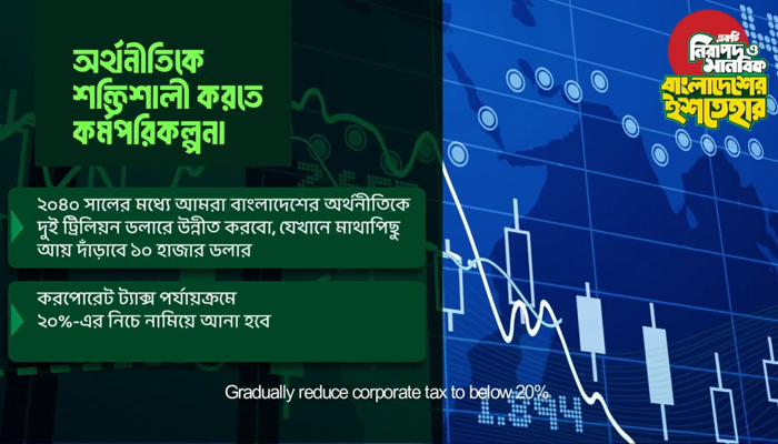 বিশ্বের ৩৫তম অর্থনীতি থেকে বাংলাদেশকে ২০তম এবং ২০৪০ সালের মধ্যে ২ ট্রিলিয়ন ডলারের অর্থনীতির দেশে উন্নীত করার ভিশন নিয়ে নির্বাচনী ইশতেহার ঘোষণা করেছে বাংলাদেশ জামায়াতে ইসলামী।