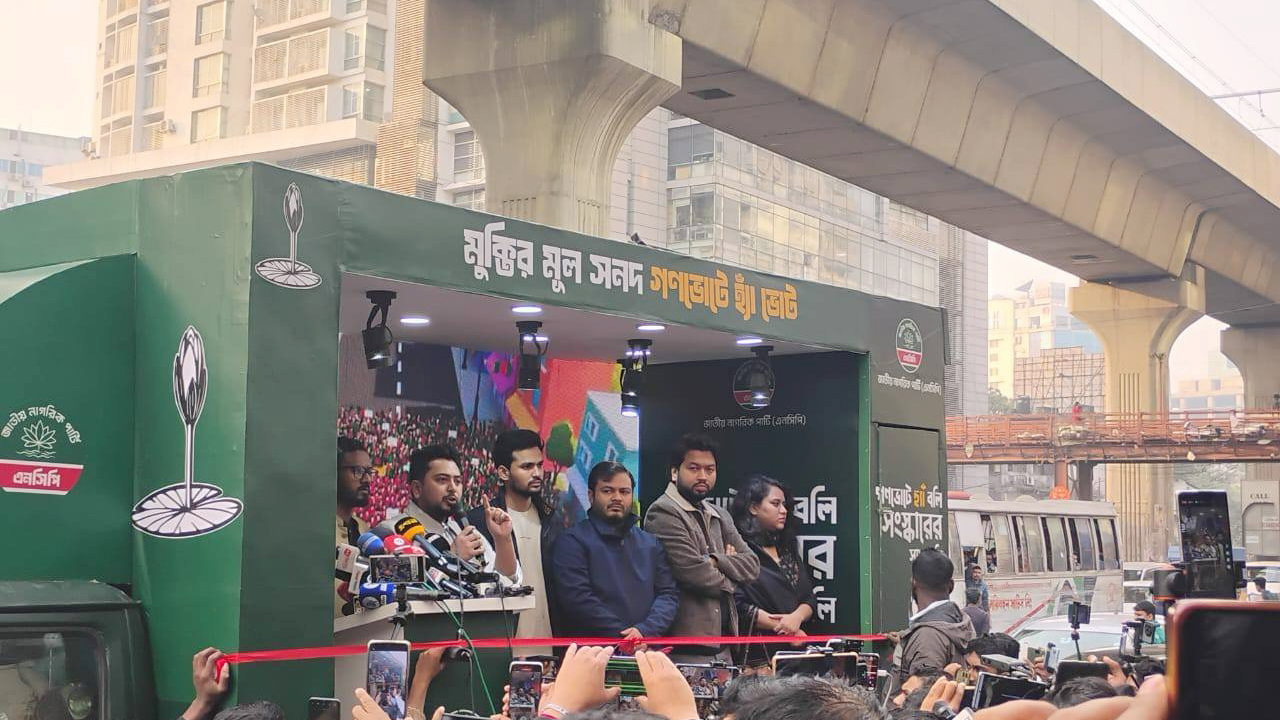 সংসদ নির্বাচনের সঙ্গে গণভোটে ‘হ্যাঁ’– এর পক্ষে জাতীয় নাগরিক পার্টি (এনসিপি) ভোটের গাড়ি (ক্যারাভ্যান) উদ্বোধন করেছে। মঙ্গলবার (১৩ জানুয়ারি) বিকেল ৪টার দিকে রাজধানীর বাংলামোটরে অস্থায়ী কার্যালয়ের সামনে এই কর্মসূচি উদ্বোধন করেন দলের আহ্বায়ক নাহিদ ইসলাম ও মুখপাত্র আসিফ মাহমুদ সজীব ভূঁইয়া।