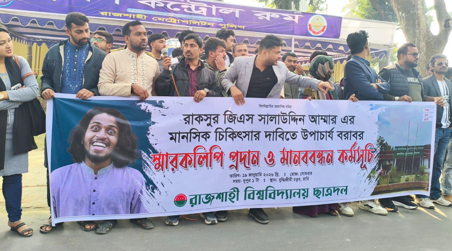 রাজশাহী বিশ্ববিদ্যালয় কেন্দ্রীয় ছাত্র সংসদের (রাকসু) সাধারণ সম্পাদক (জিএস) সালাহউদ্দিন আম্মারের মানসিক চিকিৎসার দাবি জানিয়েছে শাখা ছাত্রদল। আজ সোমবার (১৯ জানুয়ারি) দুপুরে বিশ্ববিদ্যালয়ের প্যারিস রোডে ছাত্রদল আয়োজিত পূর্বঘোষিত মানববন্ধন থেকে এই দাবি জানান তাঁরা।