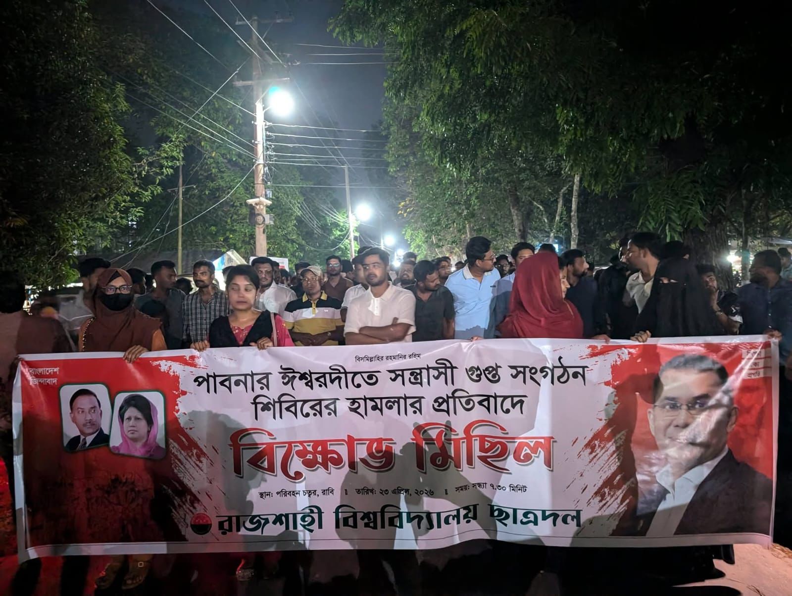 পাবনার ঈশ্বরদী সরকারি কলেজে ছাত্রদল ও ছাত্রশিবিরের সংঘর্ষের প্রতিবাদে রাজশাহী বিশ্ববিদ্যালয়ে (রাবি) বিক্ষোভ মিছিল ও সমাবেশ করেছে শাখা ছাত্রদল। বৃহস্পতিবার (২৩ এপ্রিল) রাতে এ কর্মসূচি পালিত হয়।