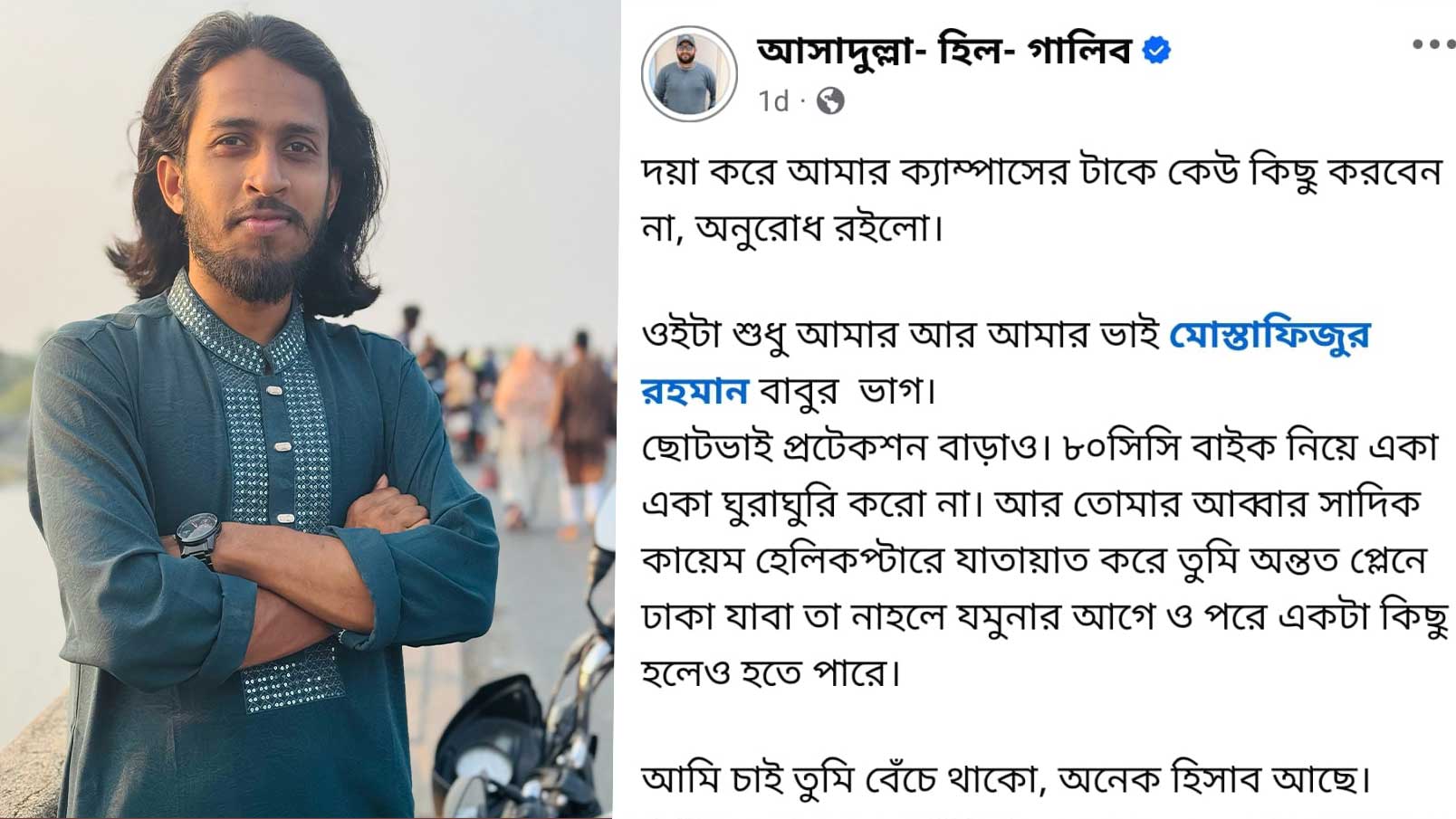 গতকাল শুক্রবার (১২ ডিসেম্বর) দুপুরে রাজধানীতে দুর্বৃত্তের গুলিতে ইনকিলাব মঞ্চের মুখপাত্র শরিফ ওসমান হাদি গুরুতর আহত হন। ওইদিন সন্ধ্যায় নিজের ভেরিফায়েড ফেসবুকে গালিব লেখেন, ‘দয়া করে আমার ক্যাম্পাসের টাকে কেউ কিছু করবেন না, অনুরোধ রইল। ওইটা শুধু আমার আর আমার ভাই মোস্তাফিজুর রহমান বাবুর ভাগ।’