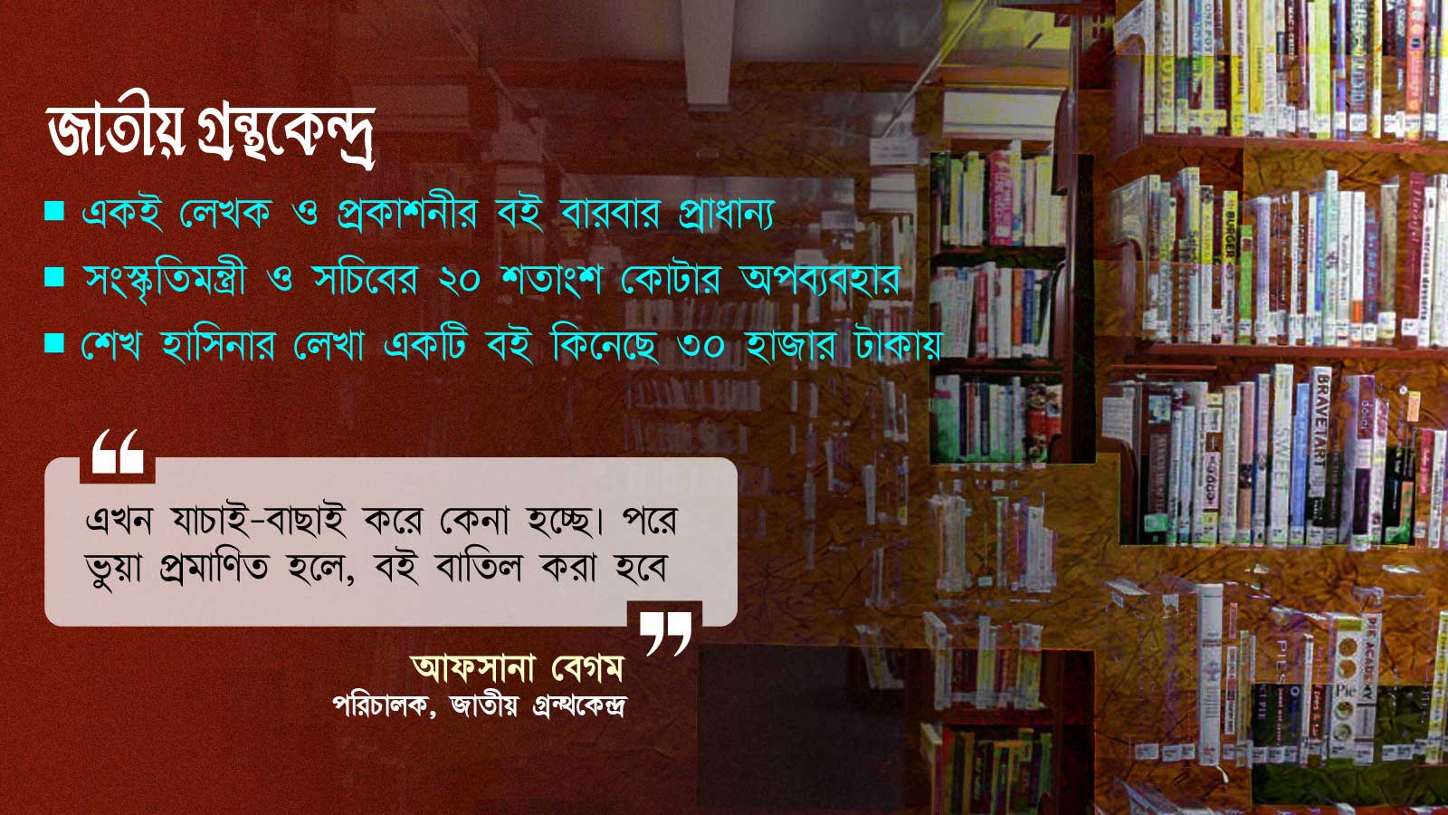 ভাঁজে কি, তা বিষয় নয়। মলাটে বঙ্গবন্ধু কিংবা শেখ পরিবারের কারও নাম মানেই গুরুত্বপূর্ণ। লুফে নিয়েছে জাতীয় গ্রন্থকেন্দ্র। ক্ষমতাচ্যুত আওয়ামী লীগের শেষ তিন অর্থবছরে প্রতিষ্ঠানটির বিরুদ্ধে মন্ত্রী-আমলাদের লেখা দ্বিগুণ দামে মানহীন, এমনকি ভারতীয় প্রকাশনীর বই কেনার অভিযোগ উঠেছে। এ জন্য অবশ্য জাতীয় গ্রন্থকেন্দ্র ‘সংস্কৃতিমন্ত্রী ও সচিবের ২০ শতাংশ কোটা’ কাজে লাগিয়েছে।