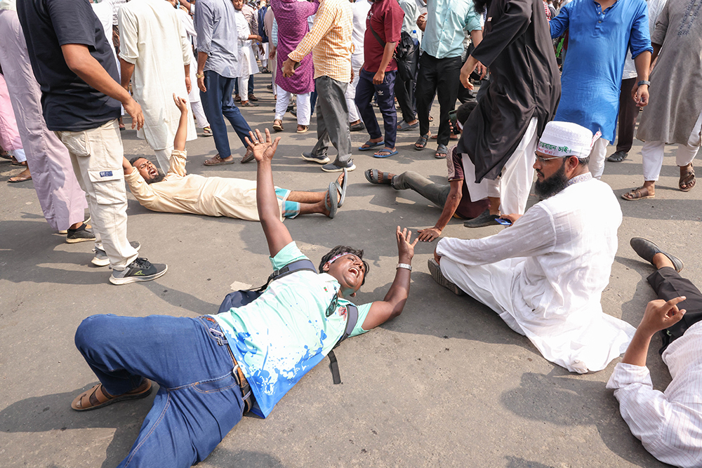 শাহবাগ মোড়ে সড়কের উপর শুয়ে পড়েছে তাঁরা
