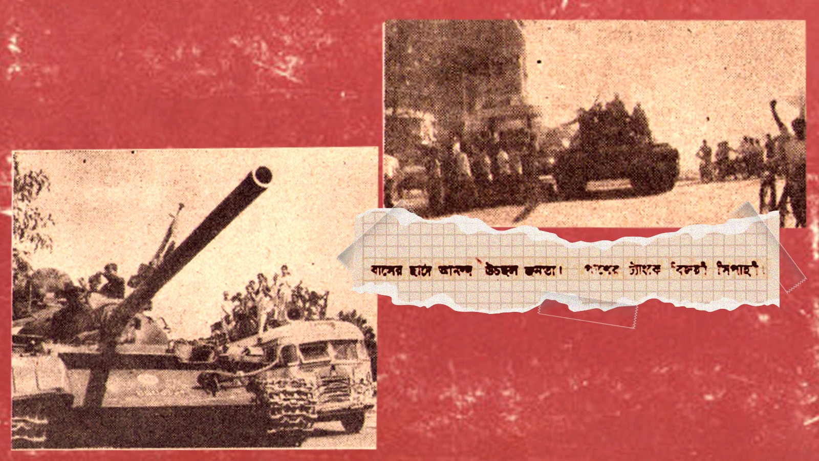 বাসের ছাদে আনন্দ উচ্ছল জনতা। পাশের ট্যাংকে বিজয়ী সিপাহী
