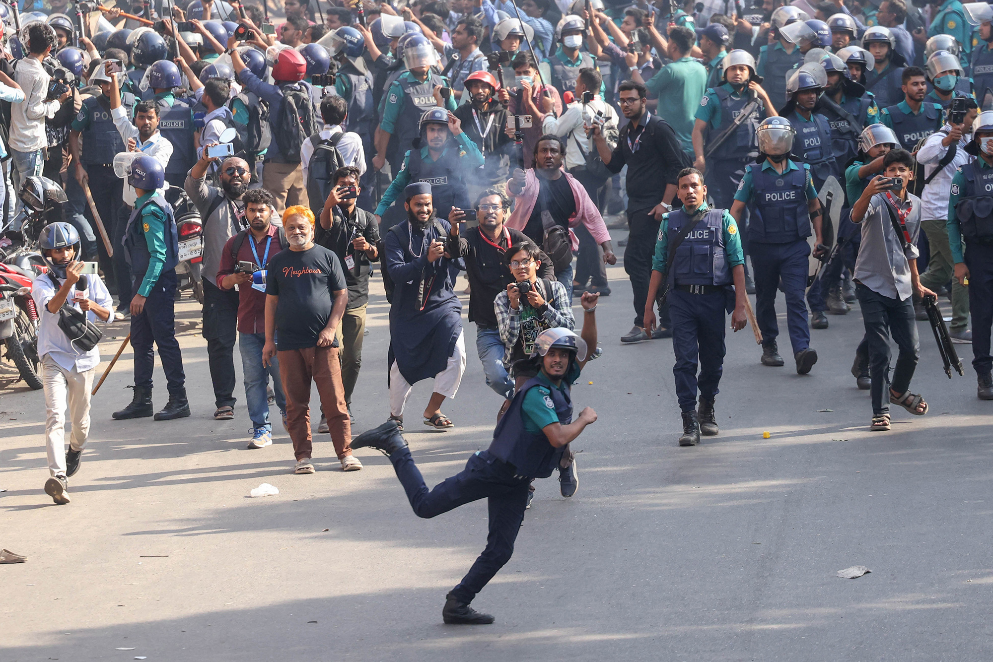 বিক্ষোভকারীদের দিকে ঢিল ছুড়ছে এক পুলিশ