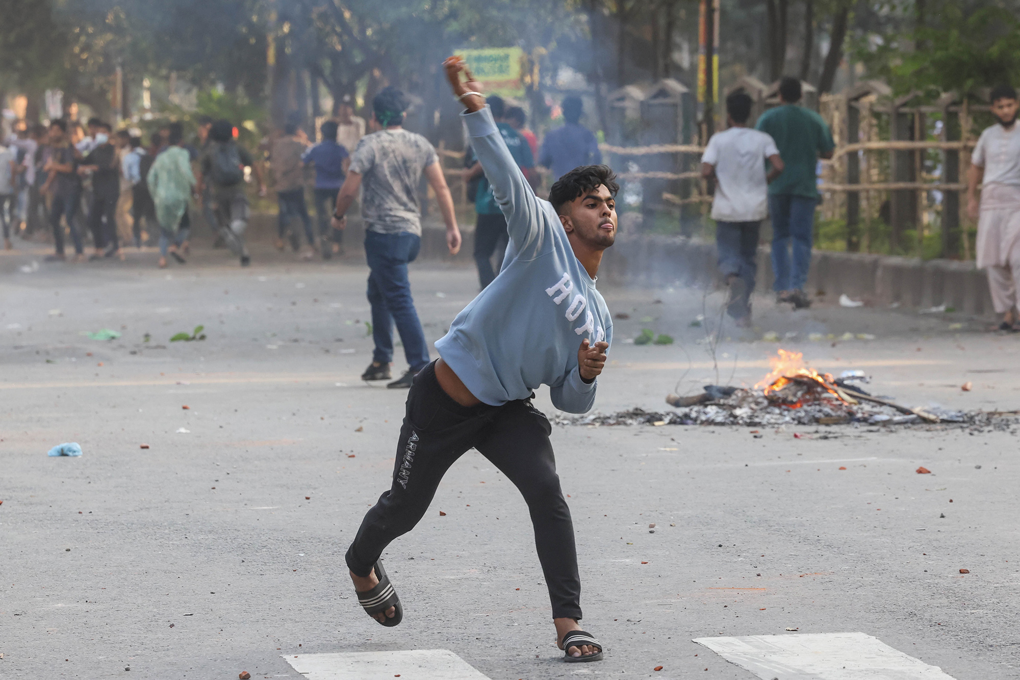 পুলিশের দিকে ঢিল ছুড়ছে এক বিক্ষোভকারী