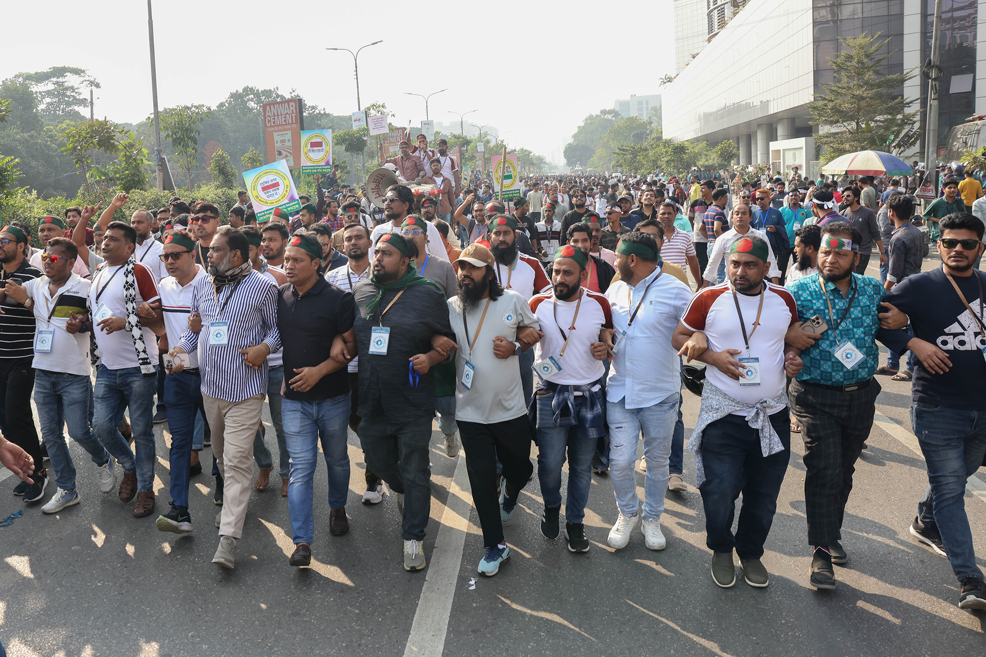 আগারগাঁও সড়কে মিছিল করছেন ফোন ব্যবসায়ীরা