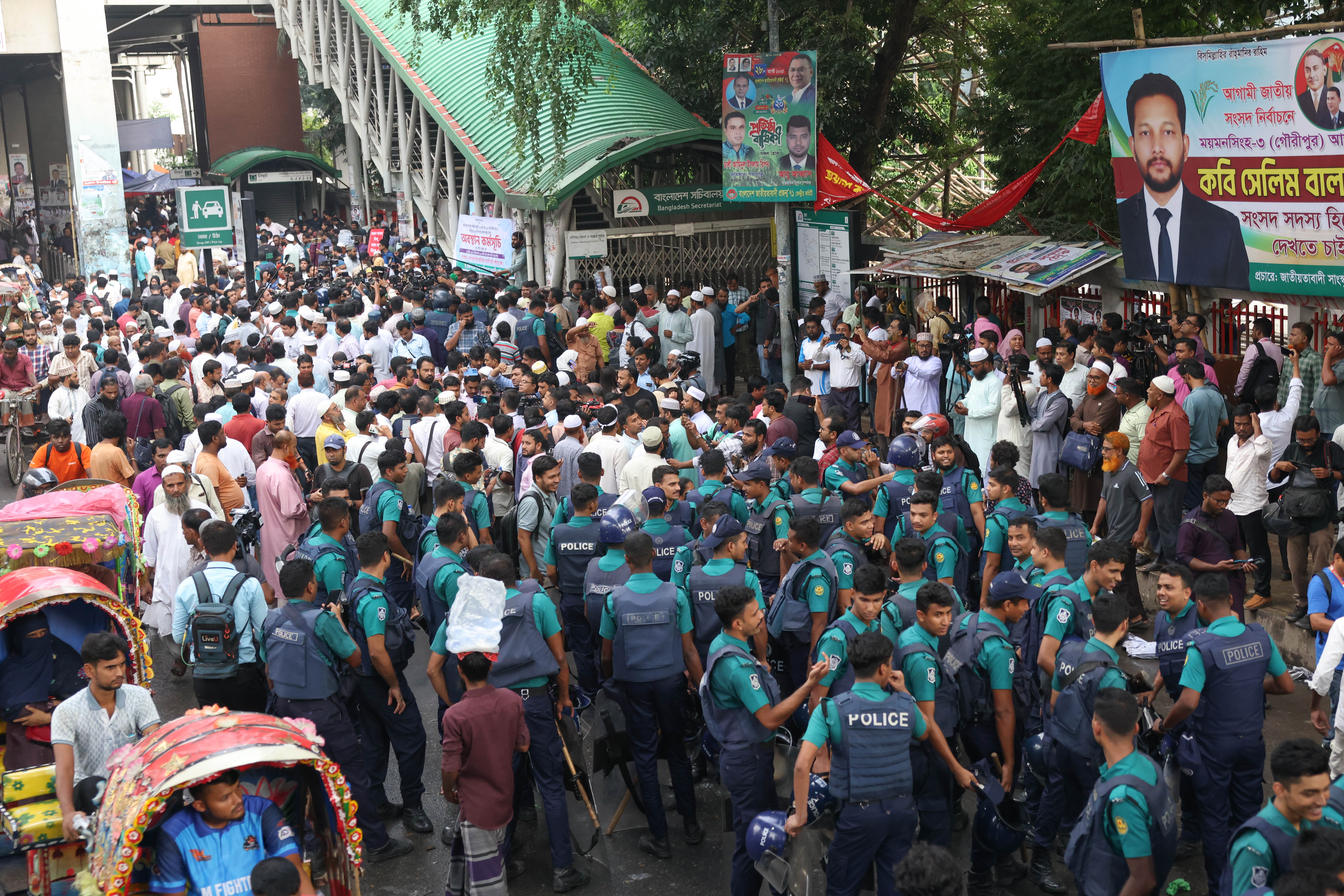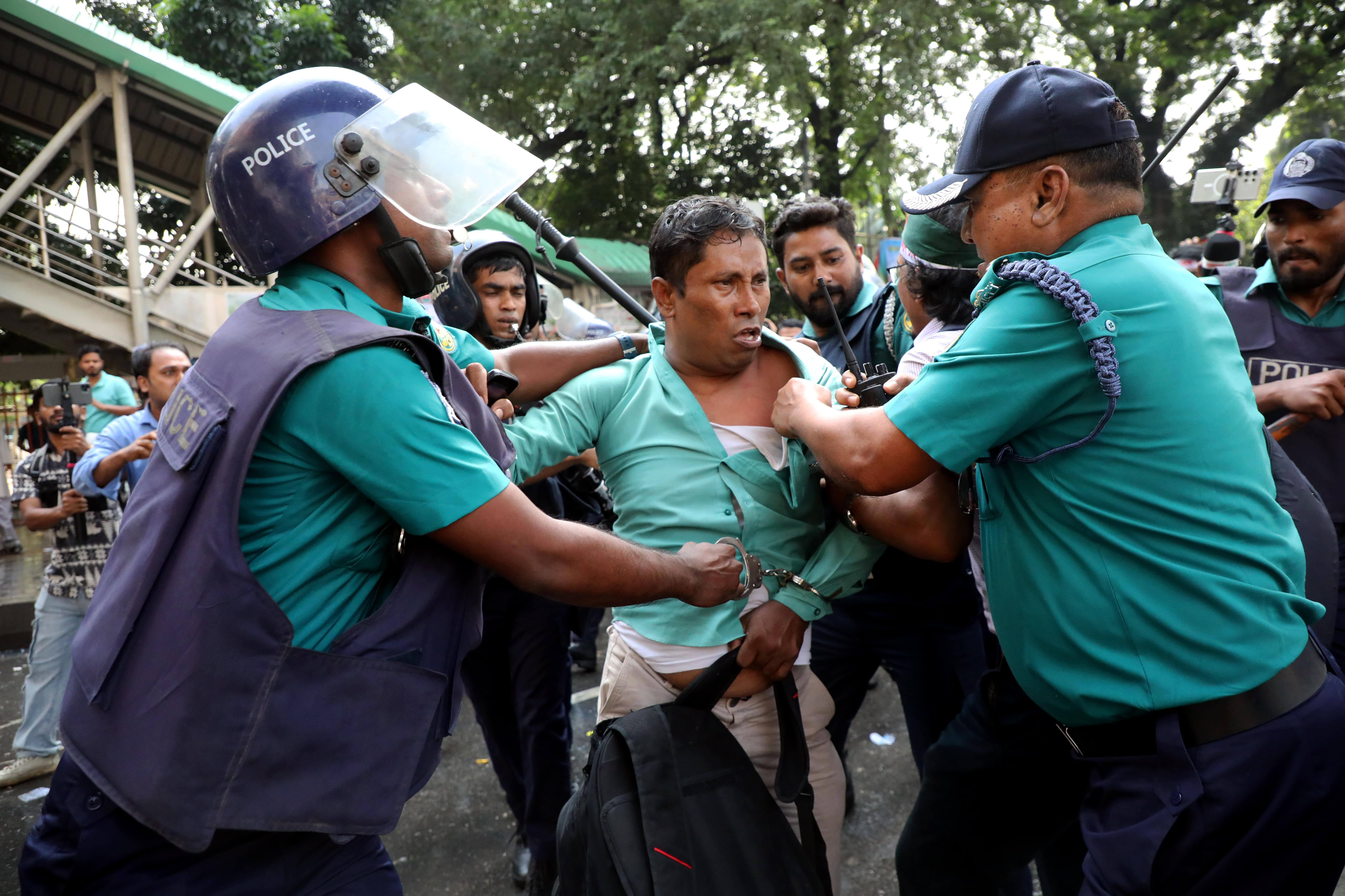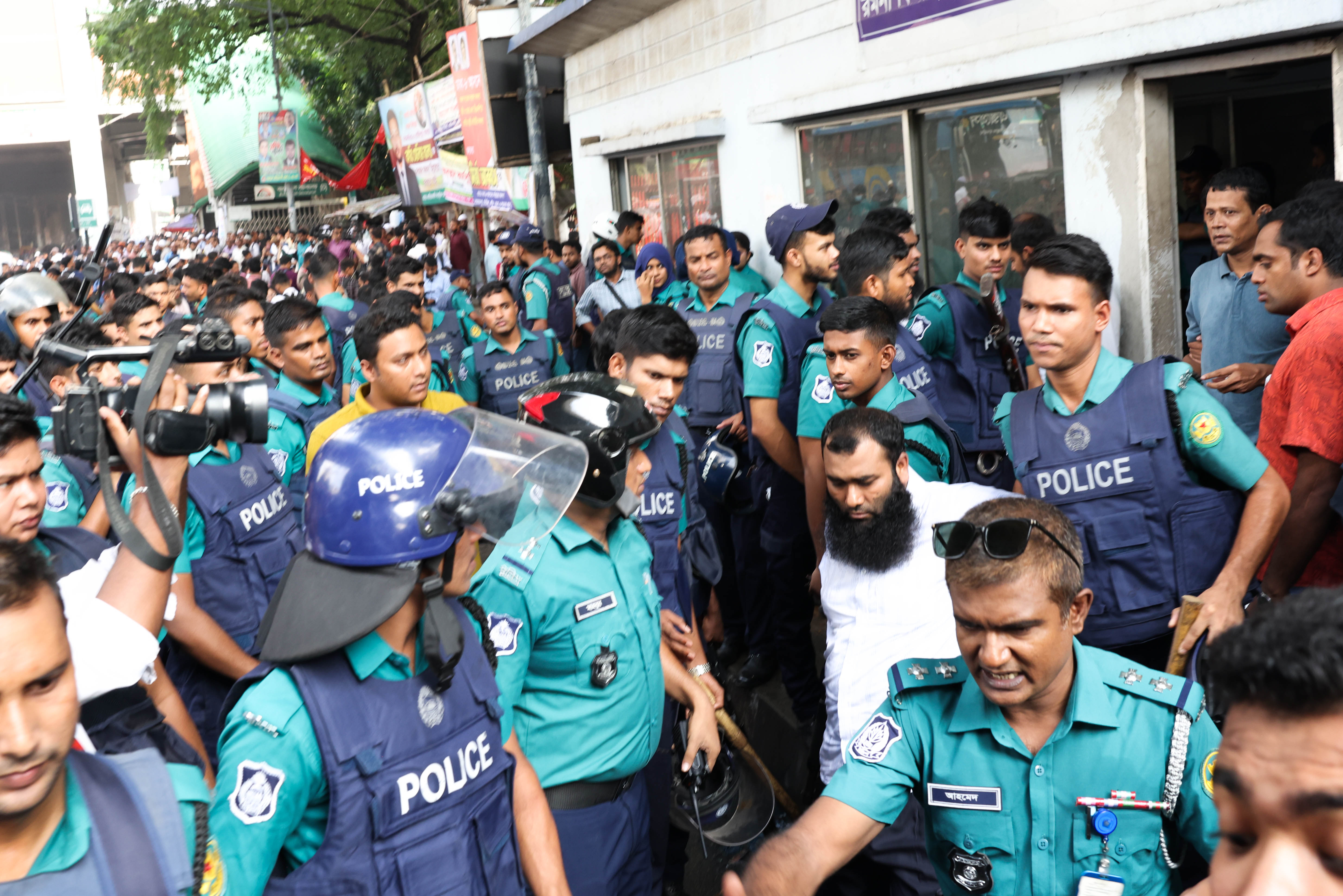 আটক করে প্রিজন ভ্যানের কাছে নেওয়া হচ্ছে। ছবি: আশরাফুল আলম