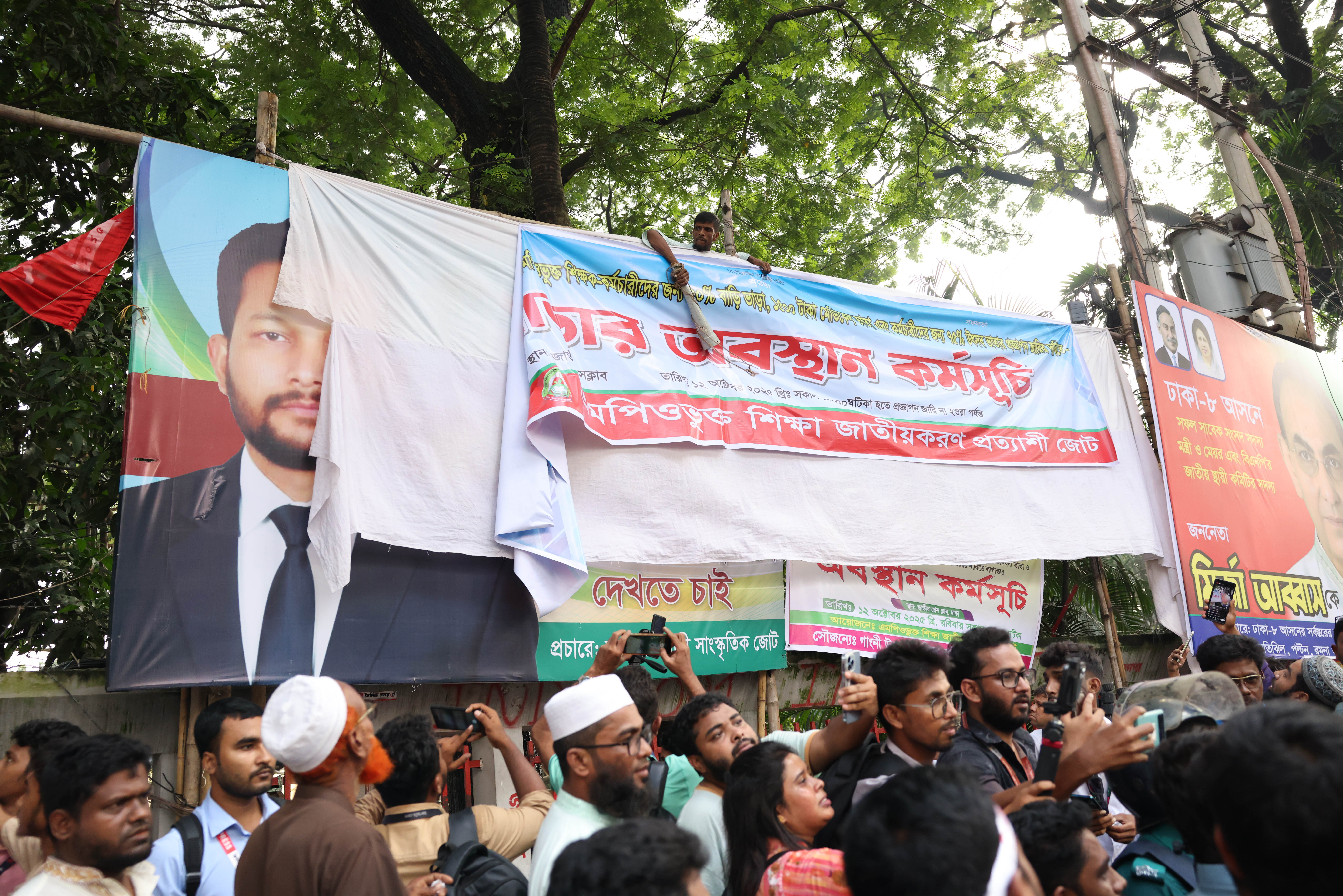 শিক্ষকদের টাঙ্গানো ব্যানার ছিঁড়ে ফেলা হচ্ছে। ছবি: আশরাফুল আলম