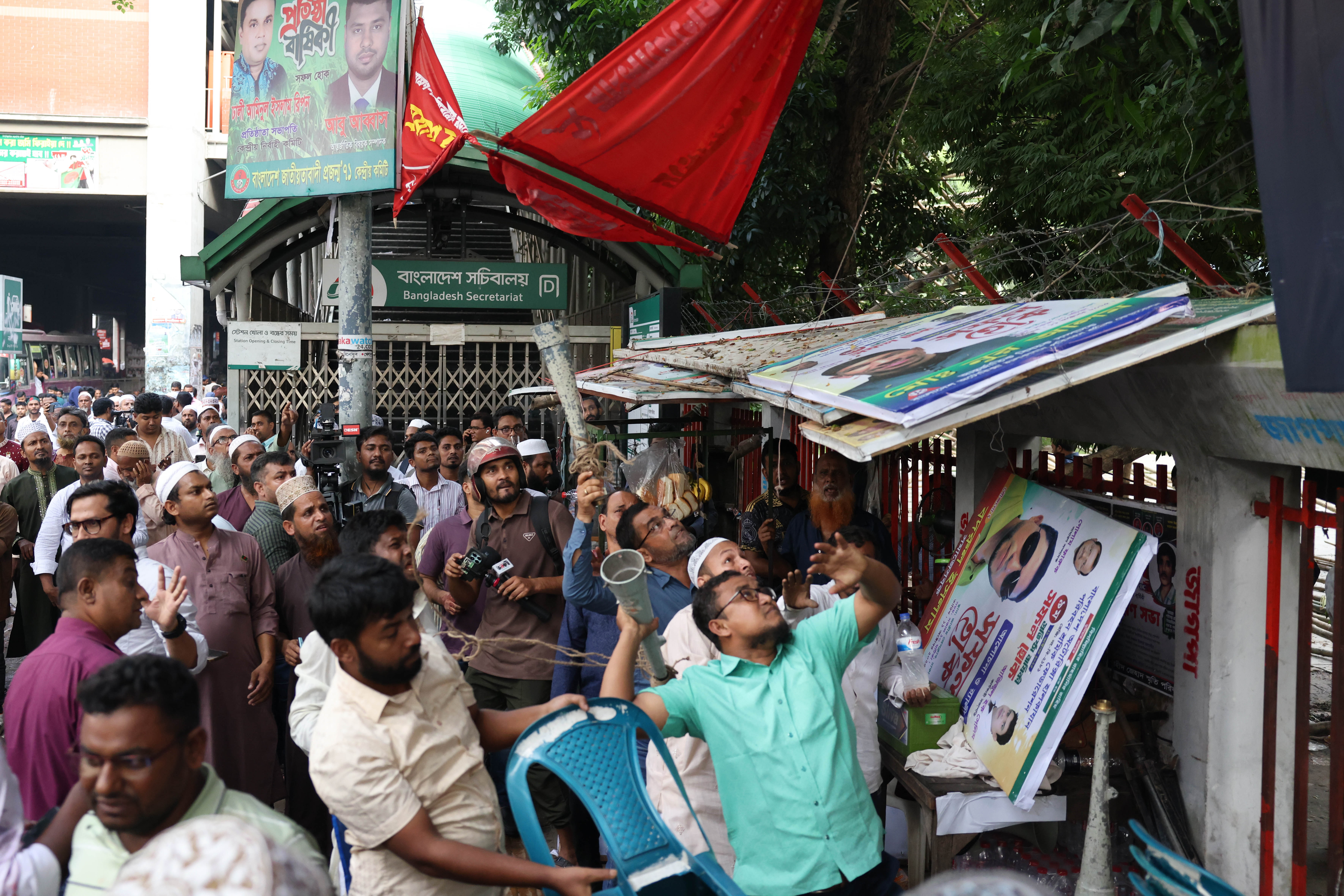 ক্ষুব্ধ শিক্ষকেরা লাঠিসোটা ছুড়ে মারছেন। ছবি: আশরাফুল আলম