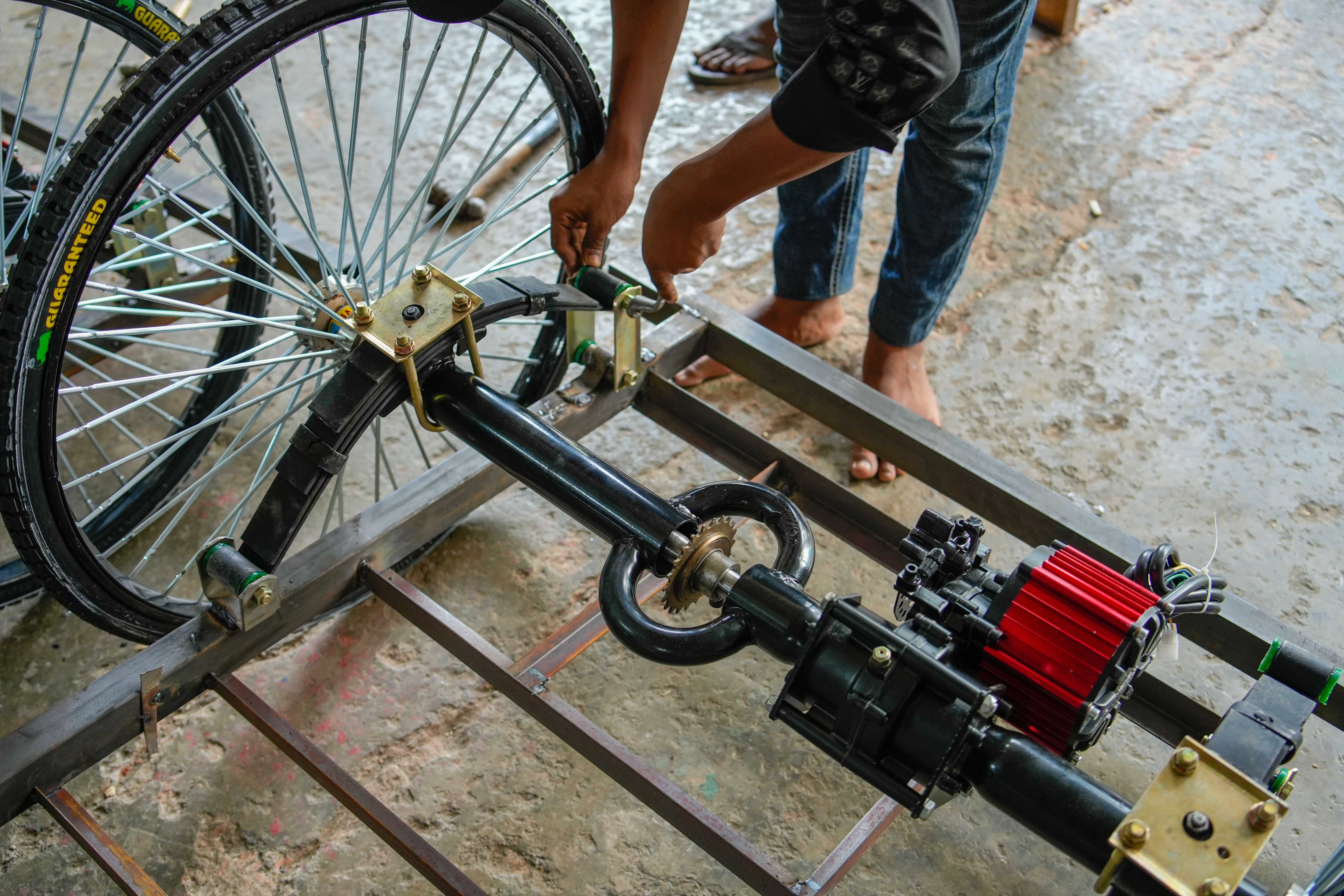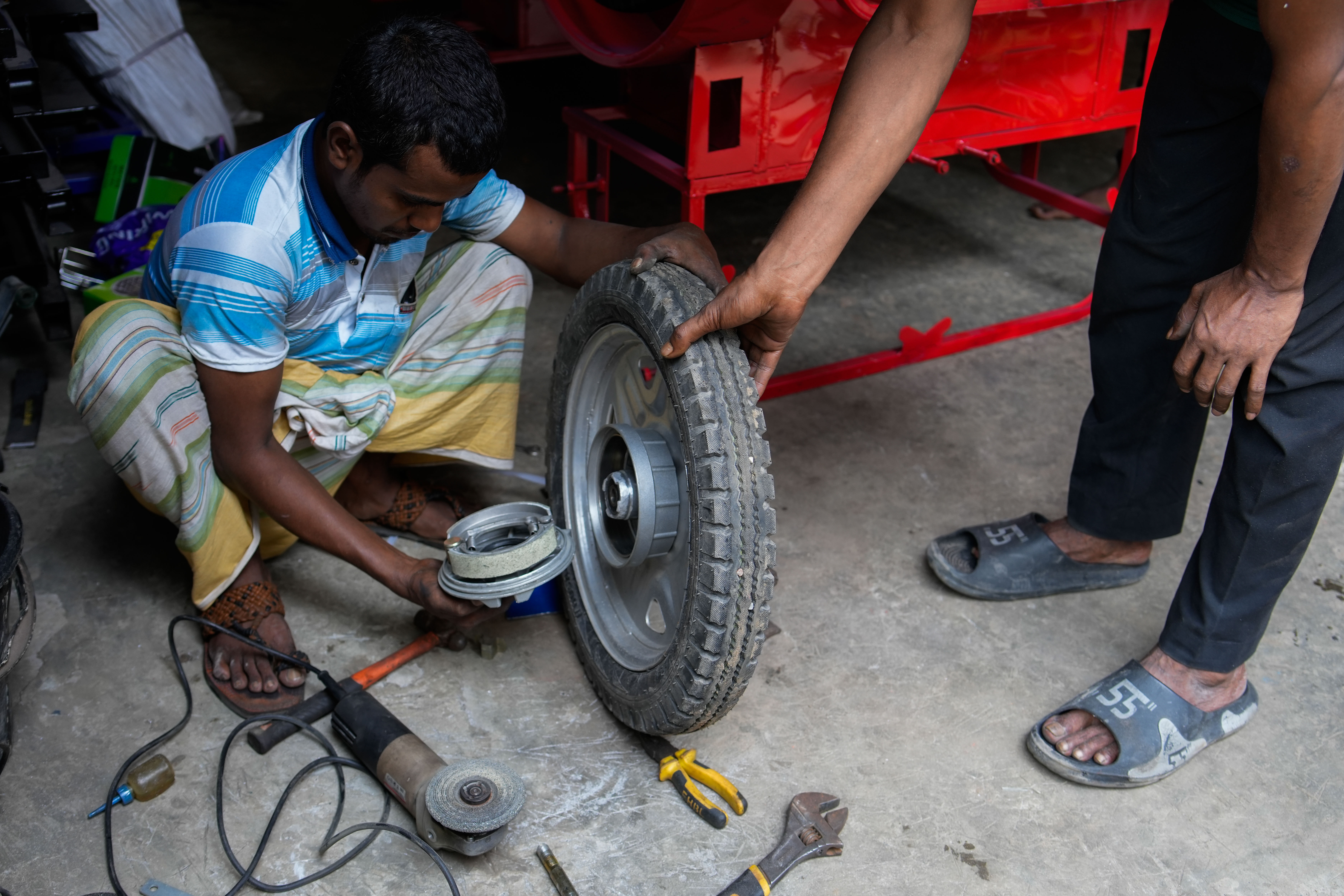 অটোরিকশা ইঞ্জিন লাগানো হচ্ছে। ছবি: নয়ন কর