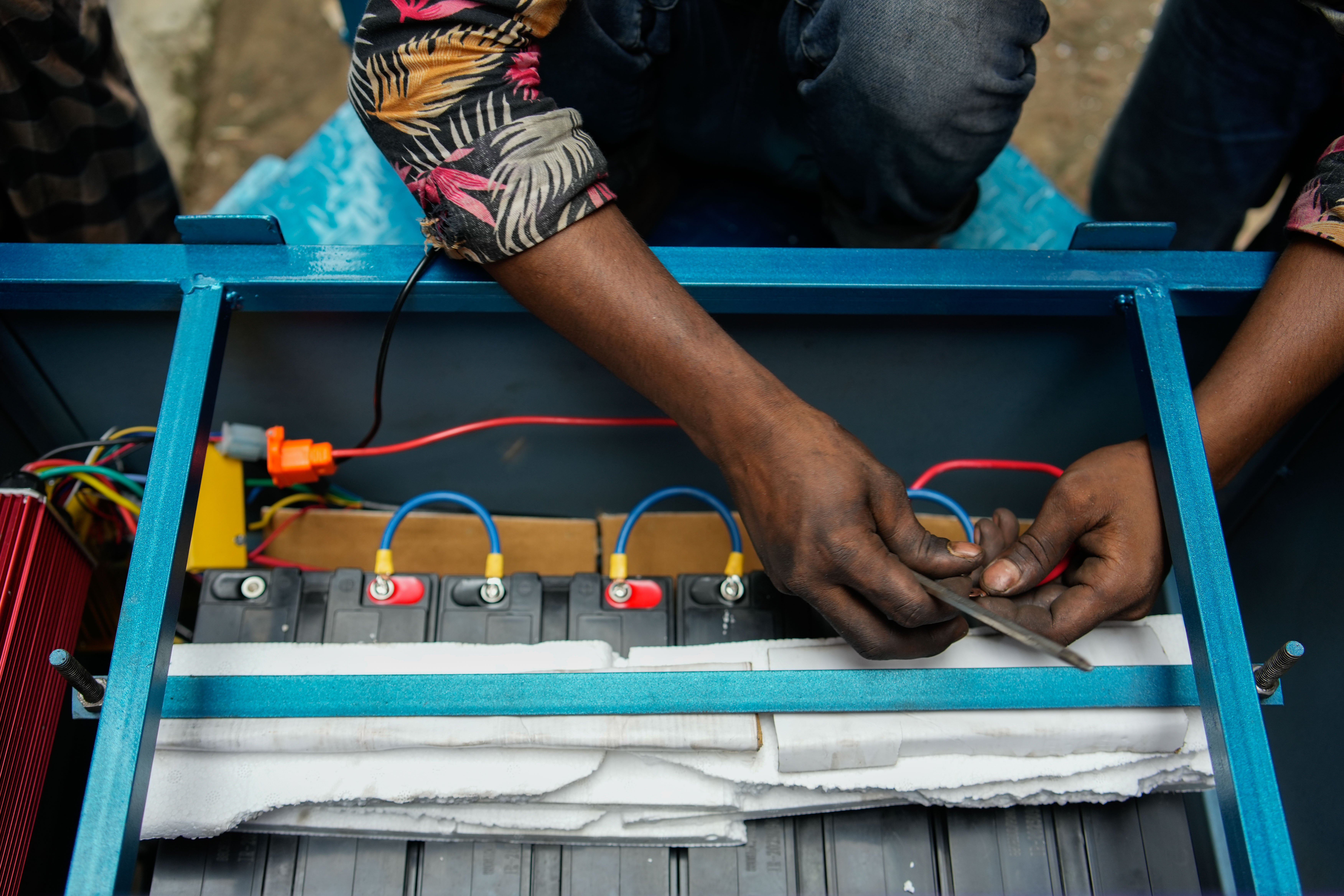 অটোরিকশায় ব্যাটারি লাগান হচ্ছে। ছবি: নয়ন কর