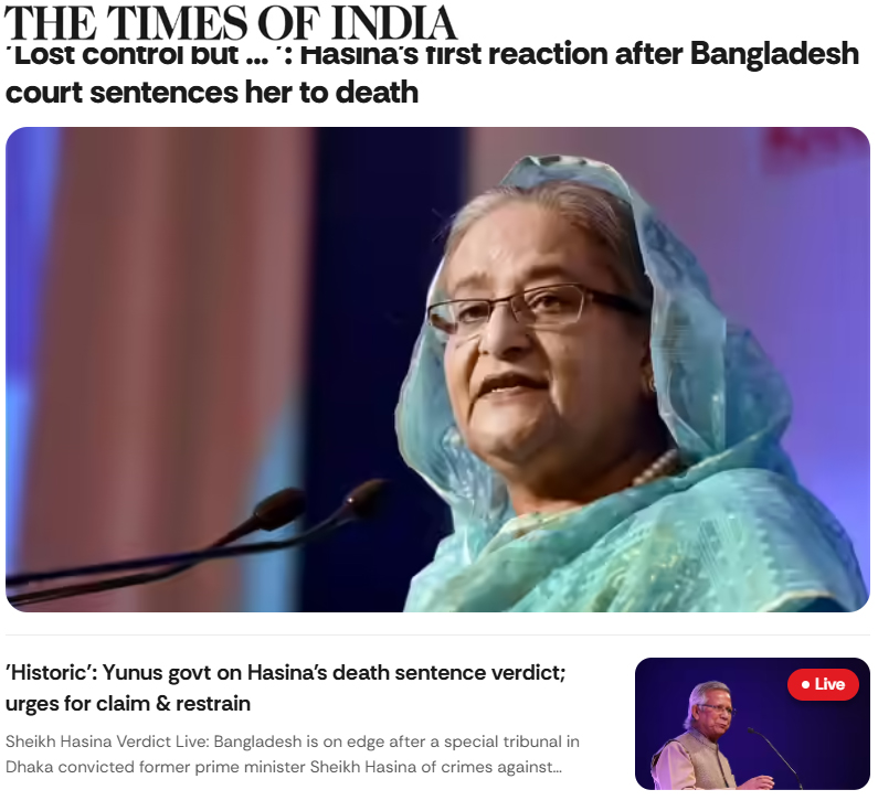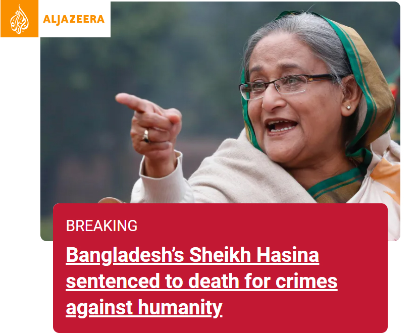 বাংলাদেশের আন্তর্জাতিক অপরাধ ট্রাইব্যুনাল (আইসিটি) স্বৈরাচারী সাবেক প্রধানমন্ত্রী শেখ হাসিনাকে মানবতাবিরোধী অপরাধের দুটি অভিযোগে মৃত্যুদণ্ড দিয়েছে। ২০২৪ সালের জুলাই-আগস্টে ছাত্রনেতৃত্বাধীন আন্দোলনে ব্যাপক হত্যাকাণ্ডের জন্য তাঁকে দায়ী করা হয়।
