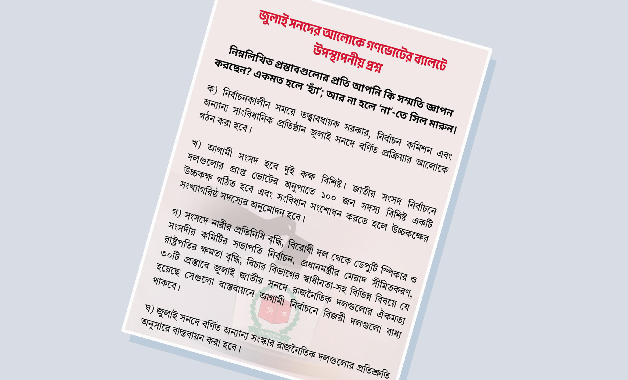 আসন্ন গণভোটে ব্যালটে যুক্ত হচ্ছে ‘জুলাই সনদে’ উল্লেখ থাকা রাজনৈতিক সংস্কার সম্পর্কিত চারটি প্রশ্ন। ভোটাররা গণভোটের দিন এই চারটি বিষয়ের ওপর একটিমাত্র প্রশ্নে ‘হ্যাঁ’ বা ‘না’ ভোট দিয়ে মতামত জানাবেন।