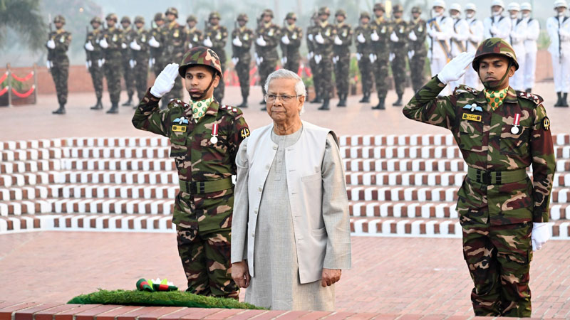 মহান বিজয় দিবস উপলক্ষে ঢাকার অদূরে সাভারে জাতীয় স্মৃতিসৌধে একাত্তরের বীর শহীদদের প্রতি ফুলেল শ্রদ্ধা জানিয়েছেন প্রধান উপদেষ্টা ড. মুহাম্মদ ইউনূস।