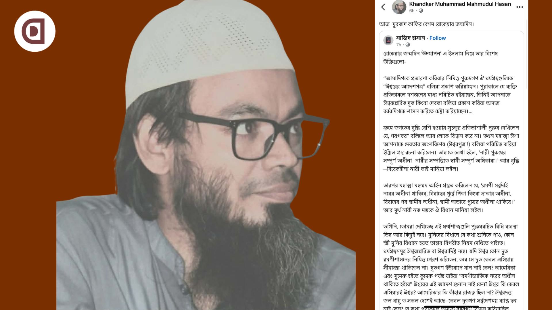 রাজশাহী বিশ্ববিদ্যালয়ের (রাবি) পদার্থবিজ্ঞান বিভাগের সহযোগী অধ্যাপক খন্দকার মাহমুদুল হাসান সামাজিক যোগাযোগমাধ্যমে নারী জাগরণের পথিকৃত বেগম রোকেয়া শাখাওয়াত হোসেনকে ‘কাফির’ ও ‘মুরতাদ’ উল্লেখ করে একটি পোস্ট শেয়ার করেছেন, যা সামাজিক মাধ্যমে ব্যাপক সমালোচনার জন্ম দিয়েছে।