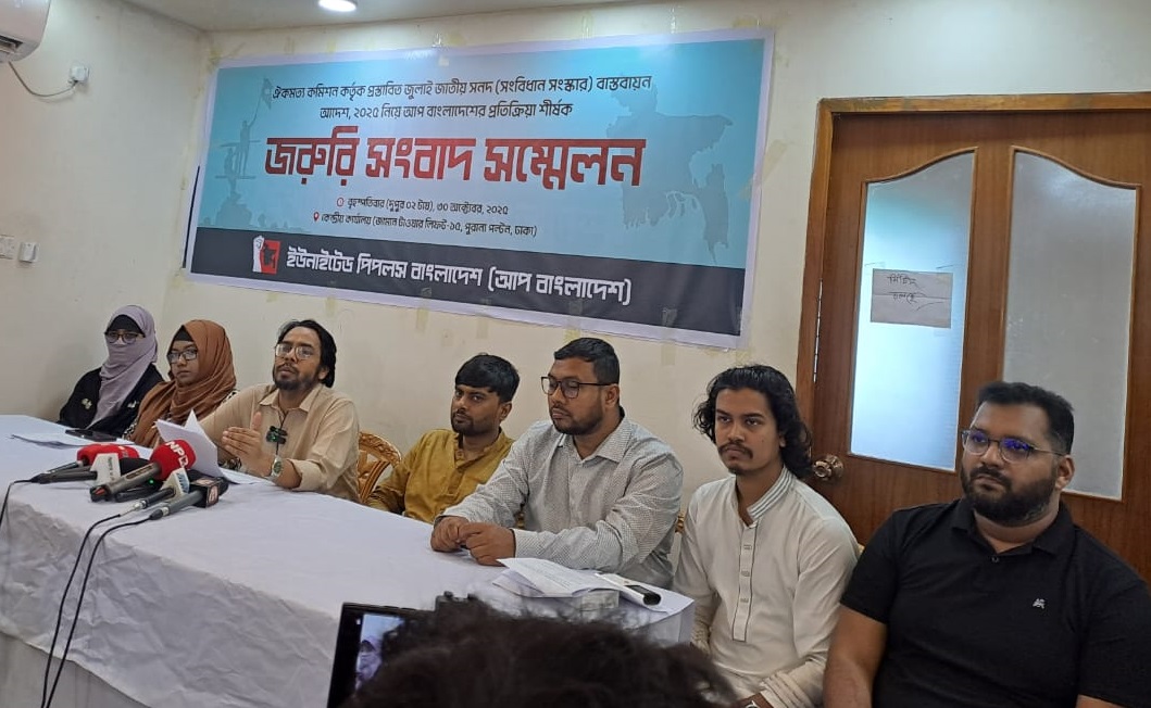 জাতীয় ঐকমত্য কমিশনের প্রস্তাবিত জুলাই জাতীয় সনদ আদেশ নিয়ে দুইটি পৃথক ব্যালটে জাতীয় নির্বাচনের দিনেই গণভোটের দাবি জানিয়েছে ইউনাইটেড পিপলস বাংলাদেশ (আপ বাংলাদেশ)। বৃহস্পতিবার (৩০ অক্টোবর) ঢাকায় এক জরুরি সংবাদ সম্মেলনে দলটির নেতারা এই প্রস্তাব করেন।