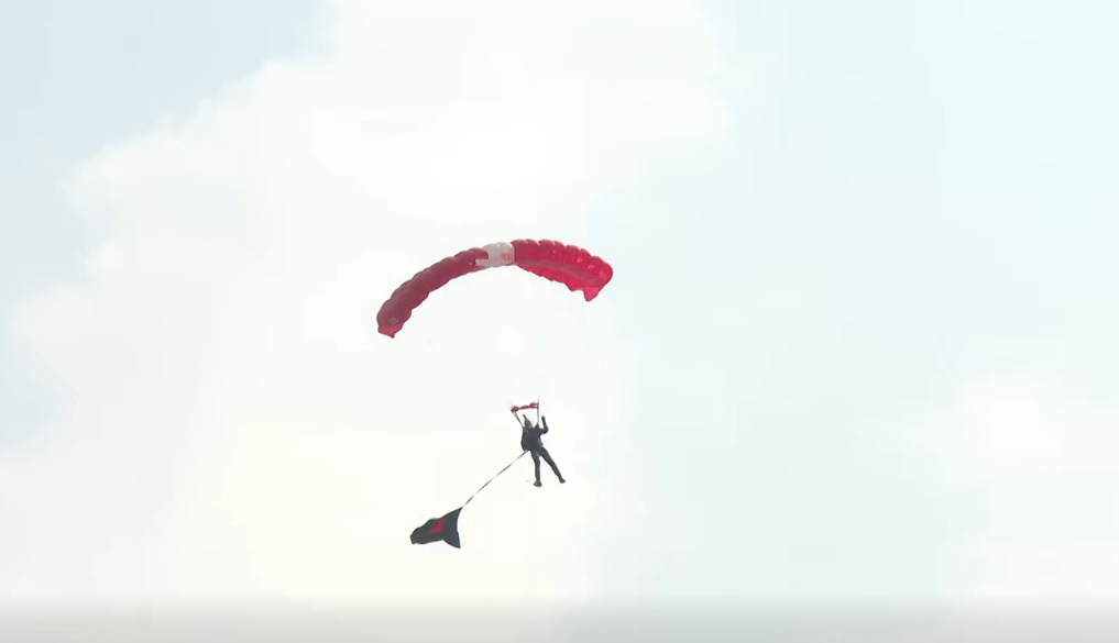 মহান বিজয় দিবসের ৫৪ বছর পূর্তিতে সম্প্রতি গুলিবিদ্ধ ইনকিলাব মঞ্চের মুখপাত্র শরীফ ওসমান হাদির ছবিসহ হেলমেট পরে প্যারাশুট থেকে ঝাঁপ দিয়েছেন বিডা চেয়ারম্যান আশিক চৌধুরী। একই সঙ্গে লাল-সবুজের পতাকা হাতে আকাশ থেকে ঝাঁপ দিয়ে বিশ্ব রেকর্ড গড়েছেন ৫৪ জন প্যারাট্রুপার।