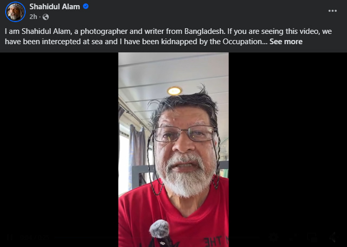 ২০২৫ সালের ৮ অক্টোবরের ভোর। ভূমধ্যসাগরের উত্তাল ঢেউ ঠেলে এগোচ্ছিল ‘কনশানস’ নামের জাহাজটি। তাতে ছিলেন বাংলাদেশের প্রখ্যাত আলোকচিত্রী শহিদুল আলম। সেই সময় তিনি নিজের শেষ বার্তাটি ধারণ করেন মোবাইল ফোনে। শান্ত কণ্ঠে বলেন, ‘আমি শহিদুল আলম, বাংলাদেশ থেকে আসা একজন ফটোগ্রাফার ও লেখক।