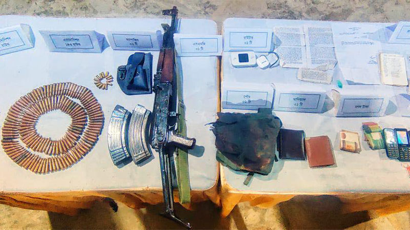 নিরাপত্তাবাহিনী বলছে, গোলাগুলির পর ঘটনাস্থলে তল্লাশি চালিয়ে জলপাই রঙের পোশাক পরা এক ব্যক্তিকে গুরুতর আহত অবস্থায় উদ্ধার করা হয়। এছাড়া এসময় একটি সাবমেশিনগান (এসএমজি), ১৪৩ রাউন্ড এসএমজি অ্যামোনিশন, ১৪ রাউন্ড পিস্তলের অ্যামোনিশন, ৫ রাউন্ড ব্লাংক অ্যামোনিশন, দুটি অস্ত্রের ম্যাগজিন এবং অন্যান্য সরঞ্জামাদি উদ্ধার করা হয়।