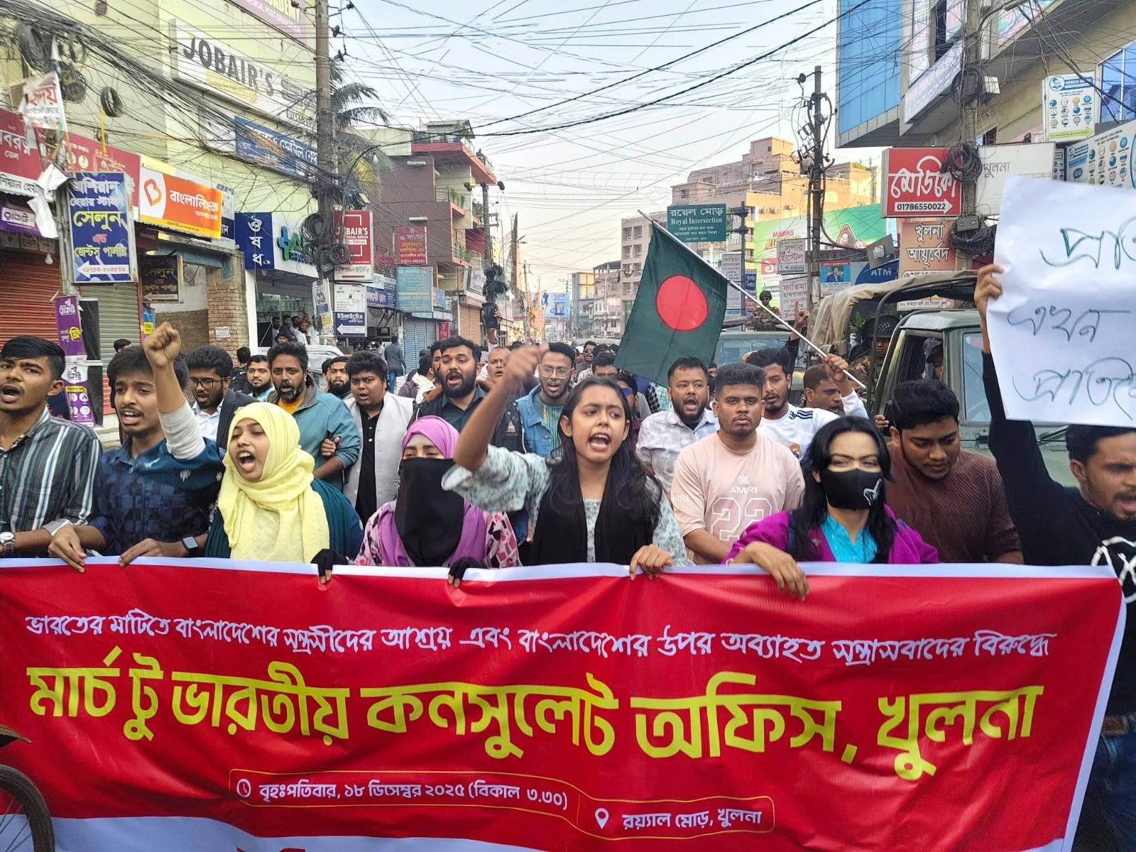 খুলনায় পুলিশের একটি ব্যারিকেড ভেঙে ভারতীয় সহকারী হাইকমিশন কার্যালয়ের সামনে বিক্ষোভ ও অবস্থান কর্মসূচি পালন করেছে বিভিন্ন ছাত্র সংগঠন। বাংলাদেশের অভ্যন্তরীণ বিষয়ে ভারতের হস্তক্ষেপের তীব্র প্রতিবাদ জানিয়ে বিভিন্ন স্লোগান দেন বিক্ষোভে অংশগ্রহণকারীরা।