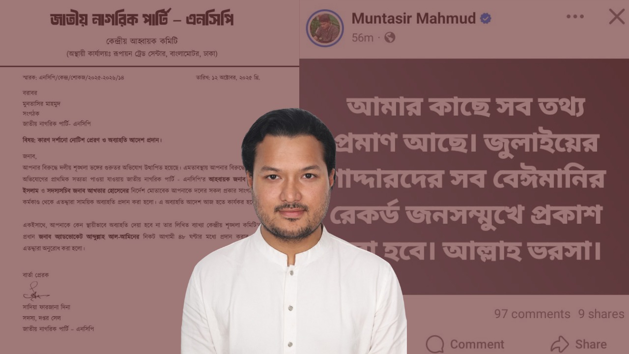 ২ মিনিট আগেদলীয় শৃঙ্খলা ভঙ্গের দায়ে জাতীয় নাগরিক পার্টির (এনসিপি) কেন্দ্রীয় কমিটির সংগঠক মুনতাসির মাহমুদকে দল থেকে সাময়িক অব্যাহতি দেওয়া হয়েছে। এর প্রতিক্রিয়ায় ‘সব বেইমানির রেকর্ড জনসম্মুখে প্রকাশ করা হবে’ করে দেওয়ার হুমকি দিয়েছেন তিনি।