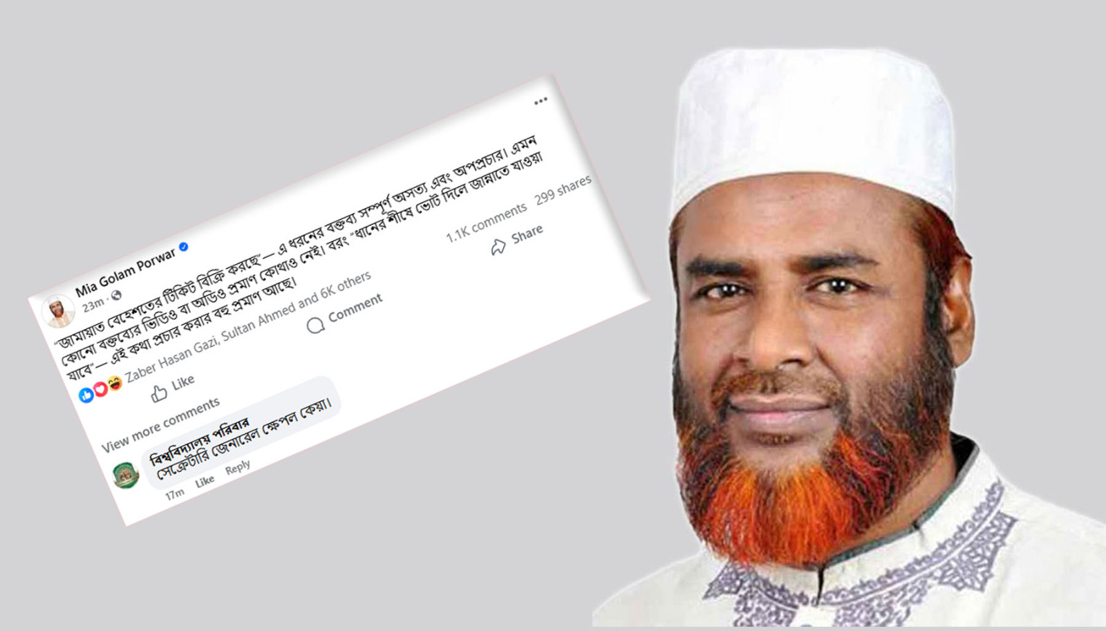 বাংলাদেশ জামায়াতে ইসলামী বেহেশতের টিকিট বিক্রি করছে—এই ধরনের বক্তব্যের কোনো প্রমাণ নেই বলে দাবি করেছেন দলটির সেক্রেটারি জেনারেল মিয়া গোলাম পরওয়ার। উল্টো ‘ধানের শীষে ভোট দিলে জান্নাতে যাওয়া যাবে’— এই কথা প্রচার করার বহু প্রমাণ আছে বলেও দাবি করেছেন তিনি।