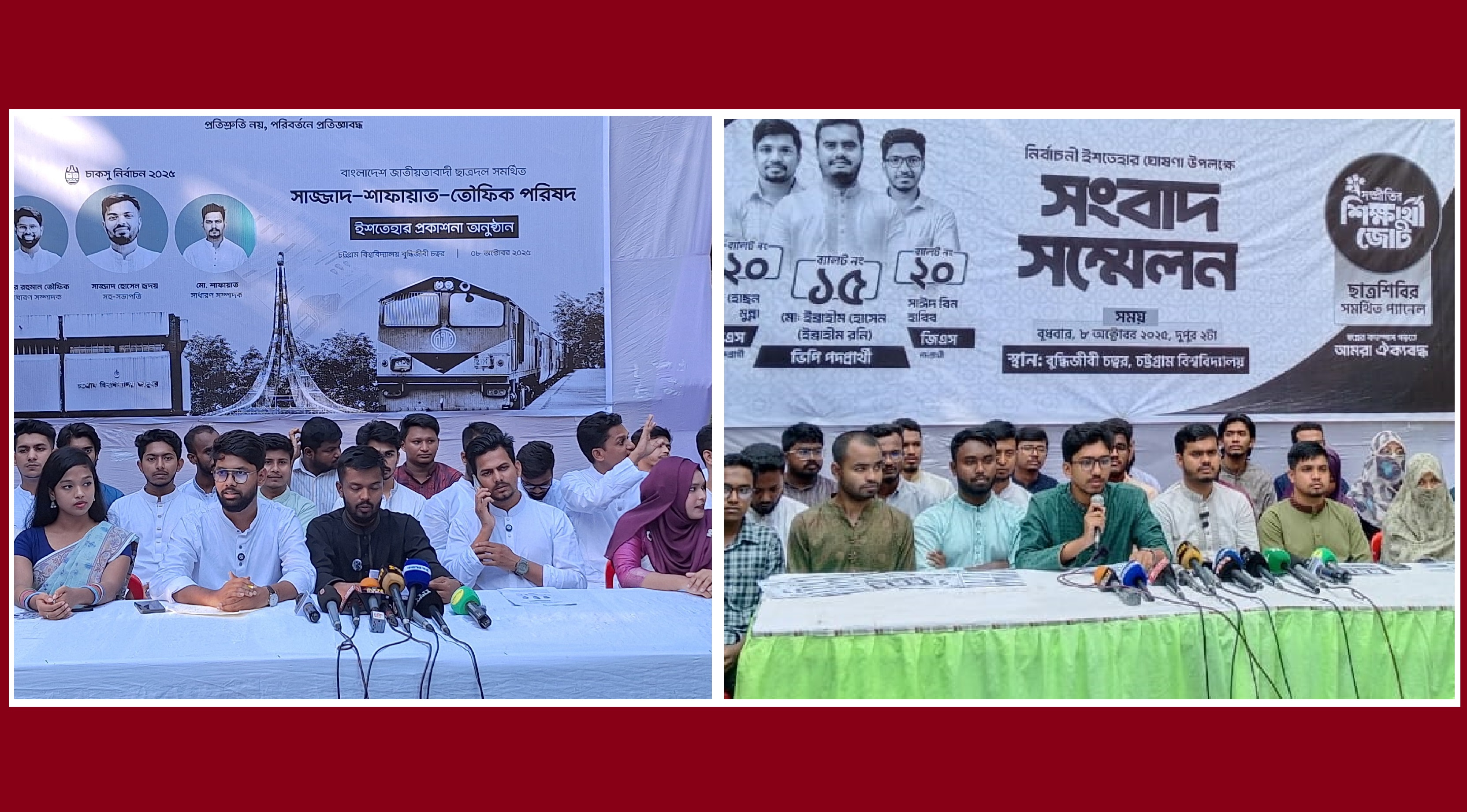 চট্টগ্রাম বিশ্ববিদ্যালয় কেন্দ্রীয় ছাত্র সংসদ (চাকসু) নির্বাচনকে সামনে রেখে ছাত্রদল ৮ দফা ও ছাত্রশিবির সমর্থিত ‘সম্প্রীতির শিক্ষার্থী জোট’ প্যানেল ৩৩ দফা ইশতেহার ঘোষণা করেছে।